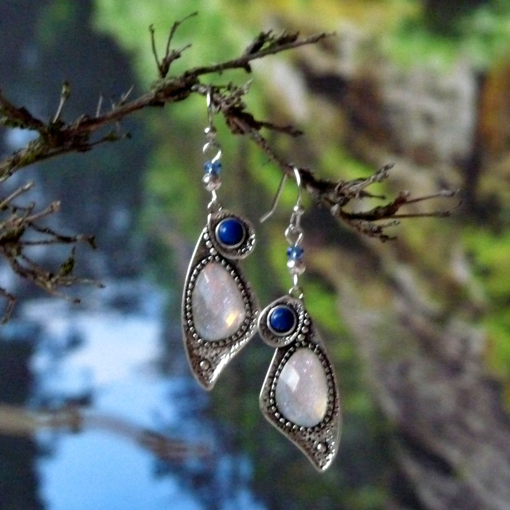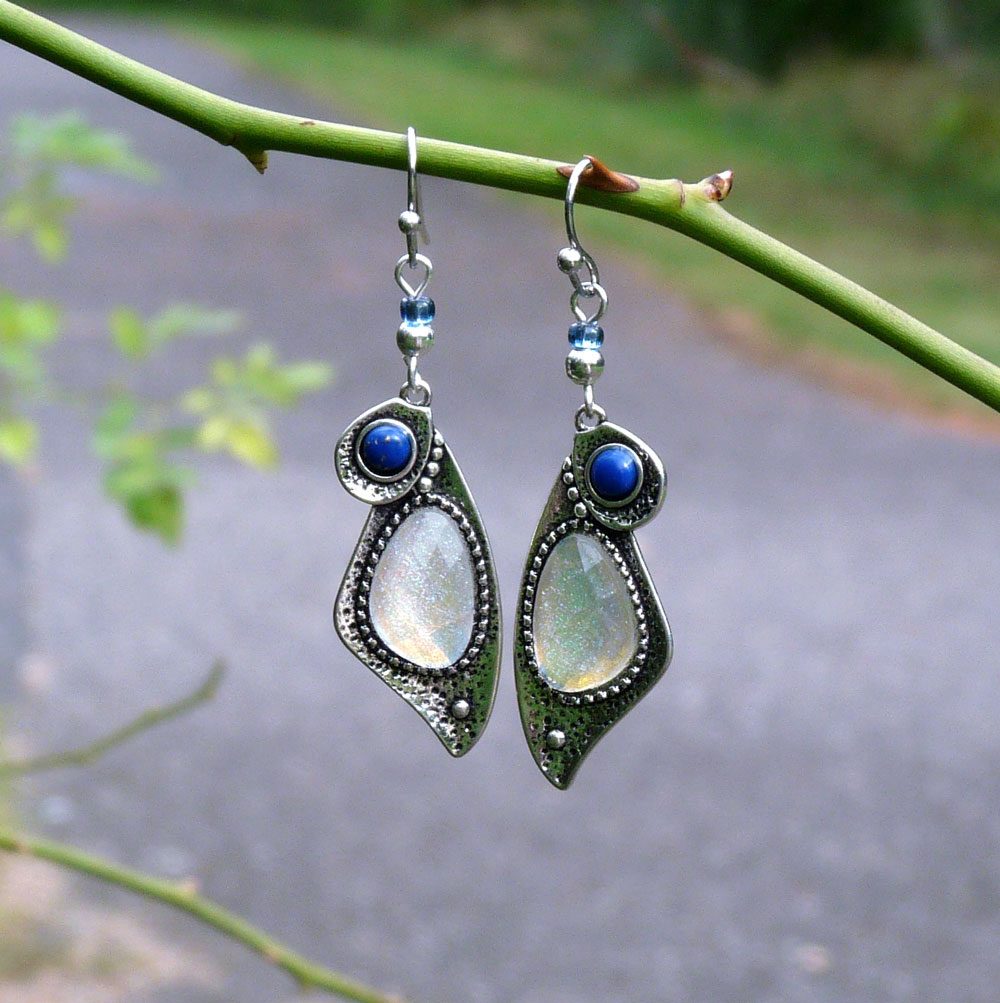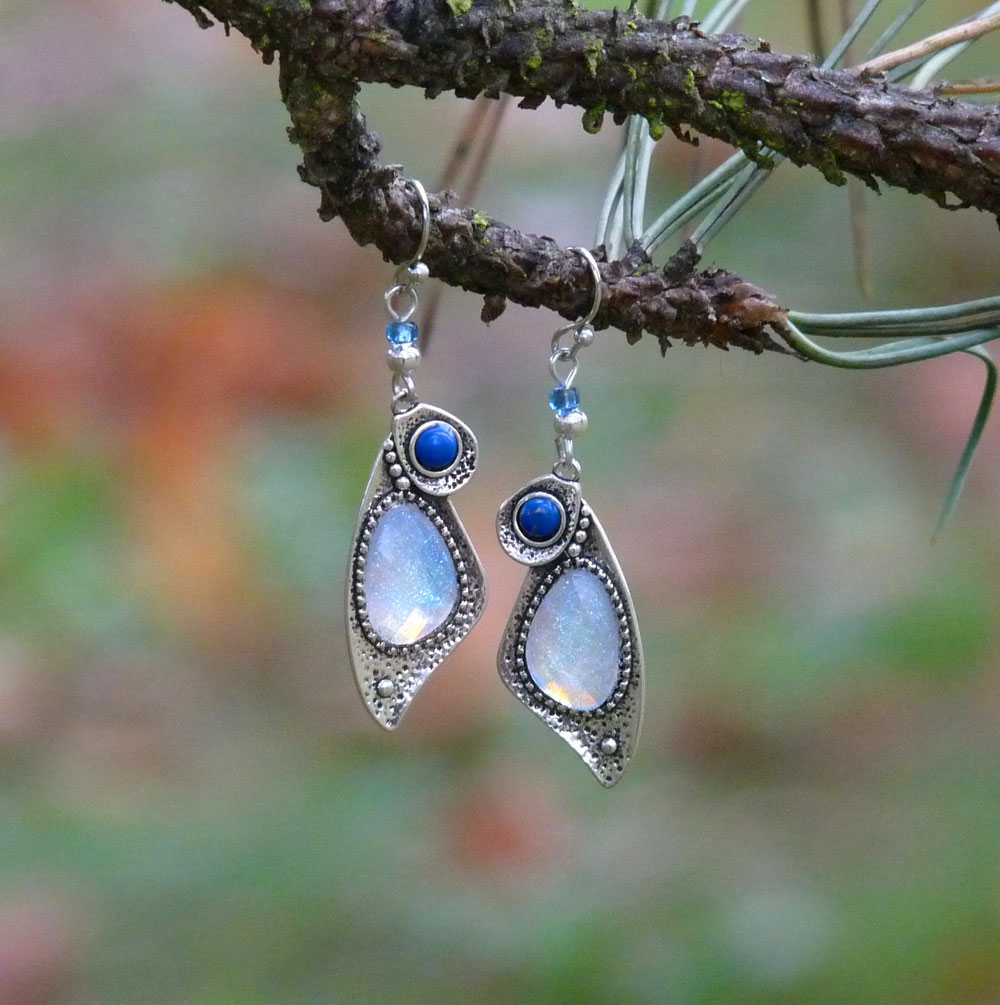 Větší kabošon je v bílé barvě s duhovým třpytem, menší kabošon je modrý.