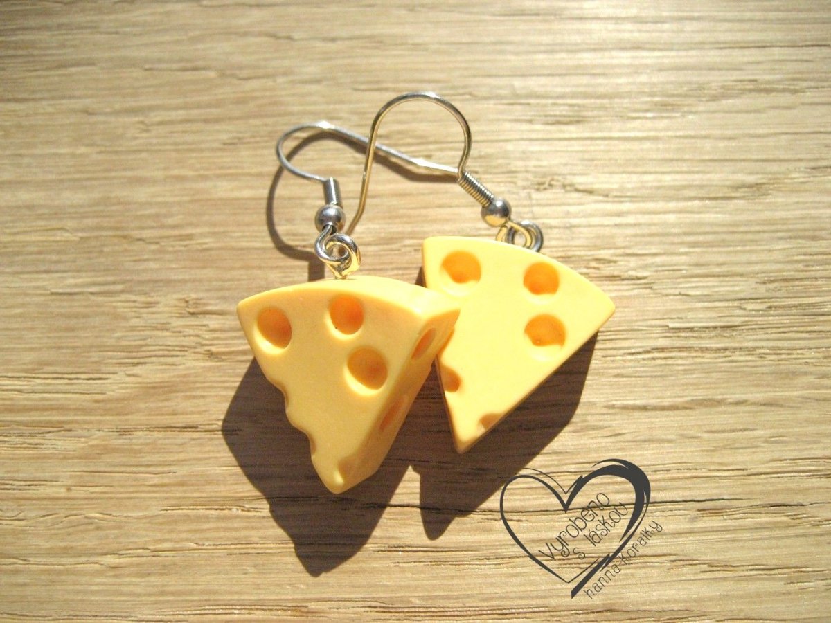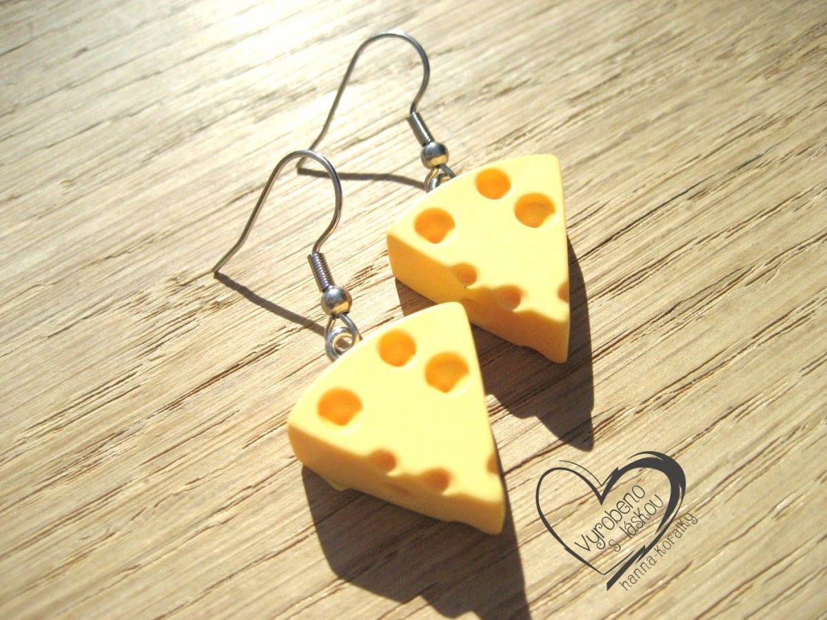 Vtipné a neobvyklé sýrové náušnice z pryskyřice - klínek tvrdého sýru - velikost motivu 2 x 2 cm + náušnicový háček z nerez oceli