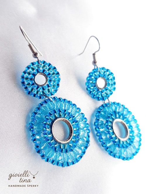 Tyto originální a nepřehlédnutelné náušnice se skládají ze dvou kulatých částí, které připomínají slunce nebo květy. Jsou pečlivě vytvořené technikou korálkové výšivky z drobných fasetovaných korálků v zářivém tyrkysově modrém odstínu. Uprostřed každé části je stříbrný kroužek, který dodává šperku moderní a čistý vzhled. Náušnice jsou zavěšené na stříbrném háčku. Díky své barvě a designu se hodí na letní dny i na oživení každodenního outfitu.