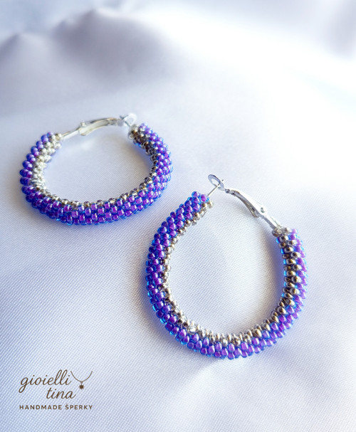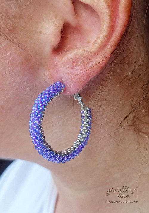 Tyto kruhové náušnice jsou ručně vyšívané z drobných korálků (rokajlů) ve dvou odstínech, které se elegantně střídají a tvoří spirálovitý vzor. Kombinace perleťově stříbrných a duhově fialových korálků připomíná galaktické mlhoviny a dodává náušnicím mystický a moderní vzhled.