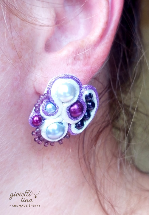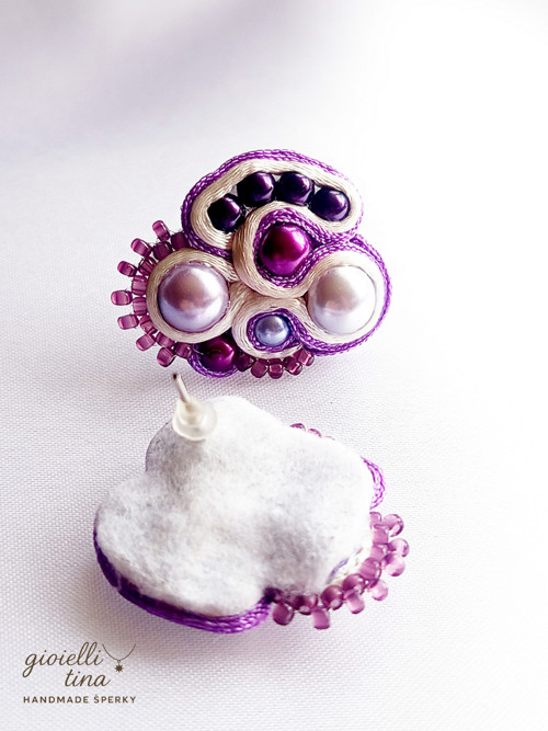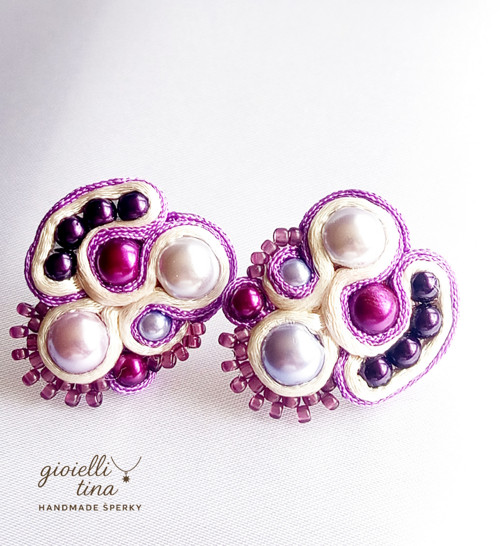 Tyto originální náušnice jsou inspirované krásou vinic a hroznů. Jsou vytvořené technikou soutache, kde jsou korálky a perly ve fialových a krémových odstínech pečlivě obšité saténovými šňůrkami.