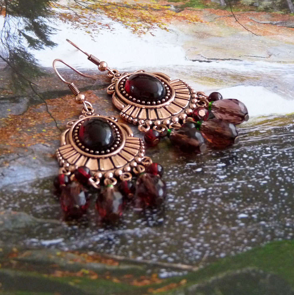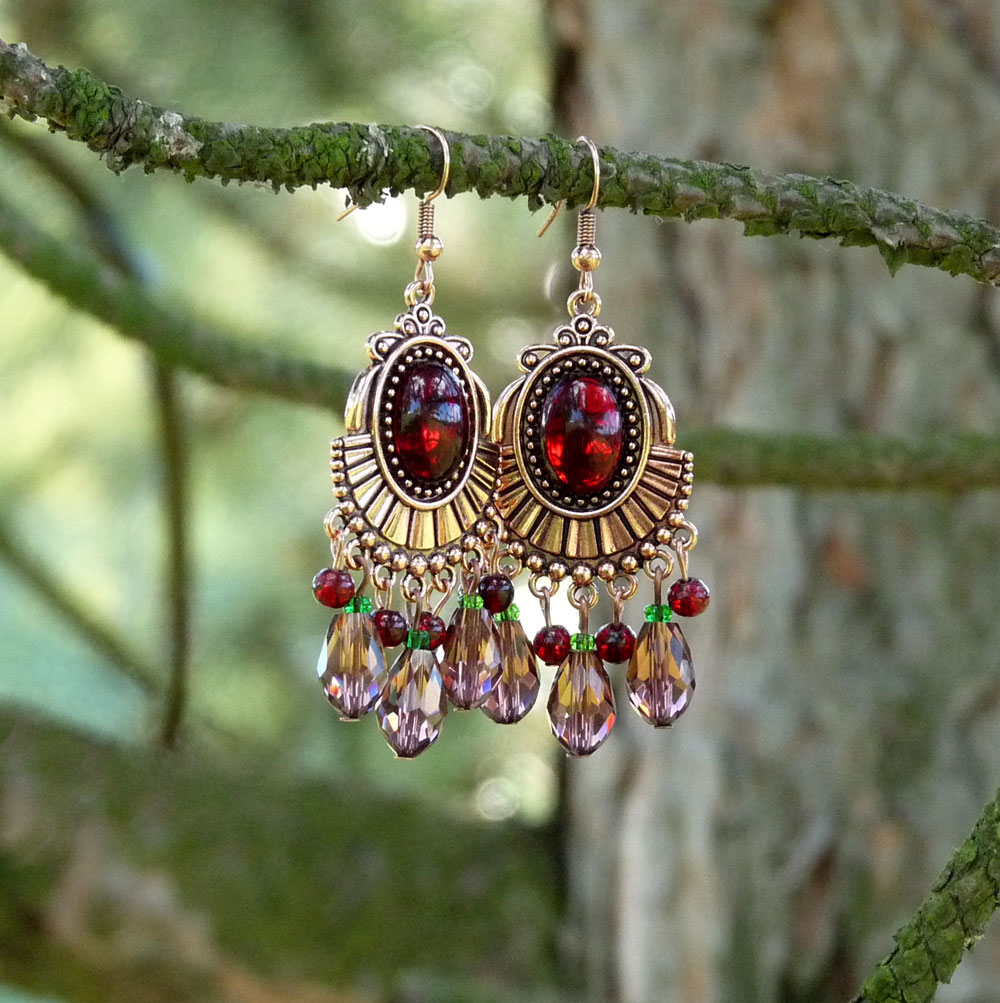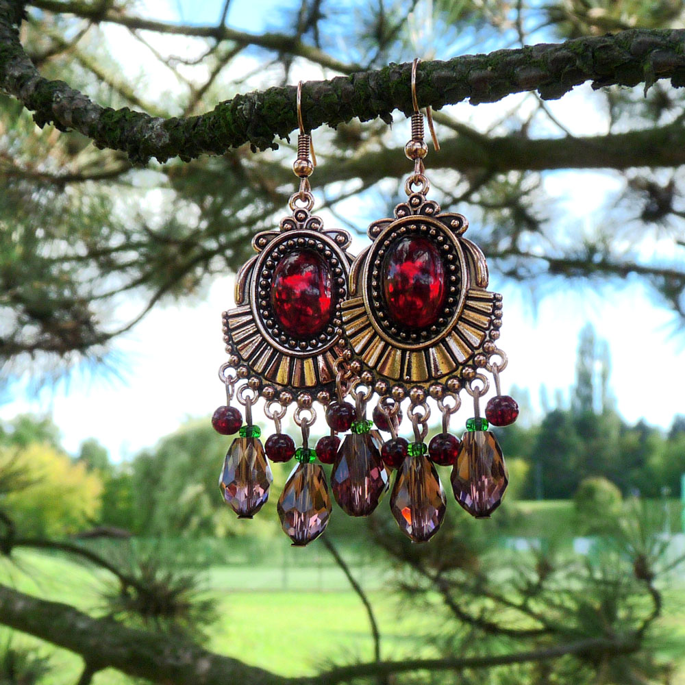 Visací náušnice tvořené zdobeným přívěskem s vlepeným kabošonem z z křišťálové pryskyřice barvené do vínova