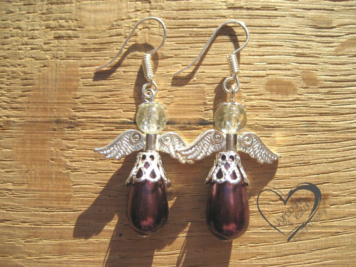 Andělské náušnice - andílci - andělíčci v kombinaci korálku v barvě - hnědovínová a stříbrných bižuterních komponentů, délka 3 cm + náušnicový háček