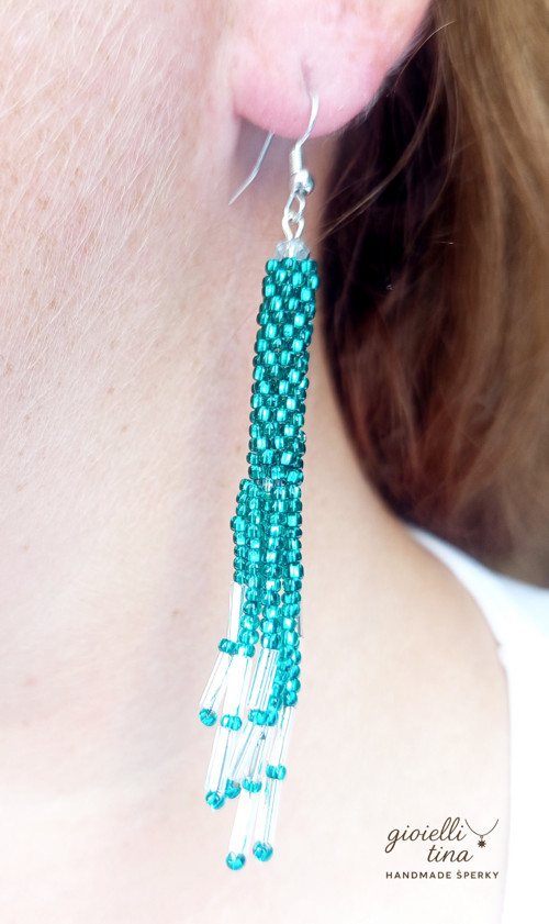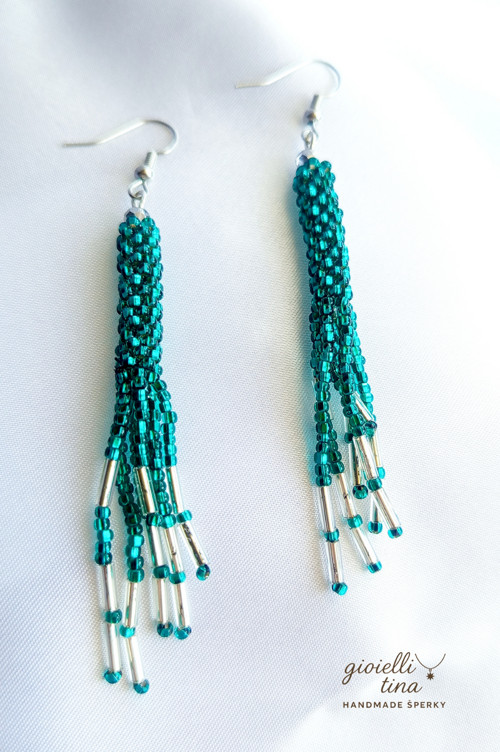 Náušnice jsou ručně vyrobené z drobných rokajlů v sytě zeleno modré barvě, které tvoří třásně. Korálky se postupně prolínají s lesklými stříbrnými válečky, připomínajícími kapky vody.