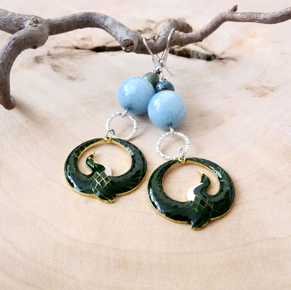 Pod velkou výběrovou kuličkou akvamarínu je zavěšen na ozdobném kroužku velký kruhový přívěsek jeřába