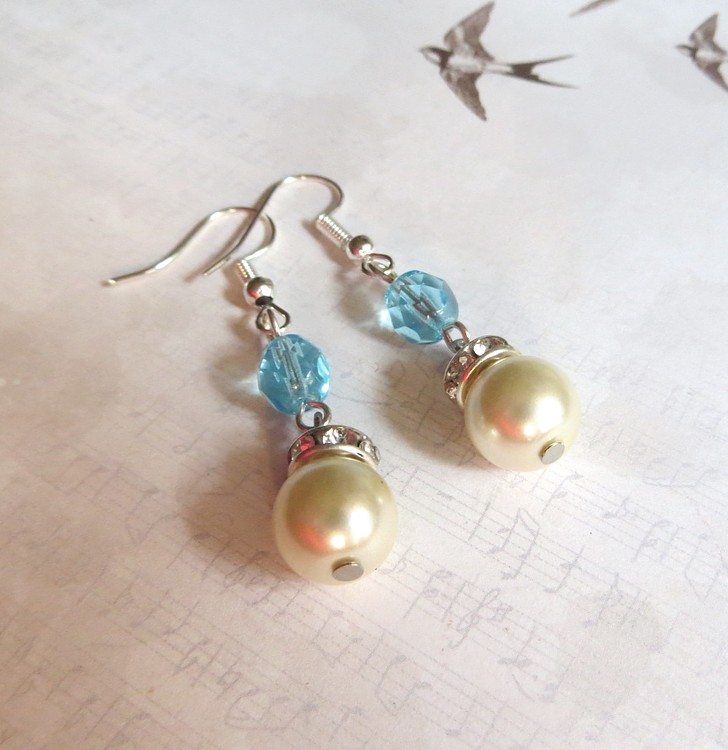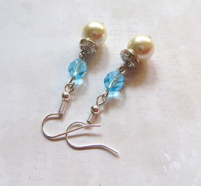 Romantické náušnice vyrobené ze skleněných voskovaných perlí, broušených korálků - ohňovek - a rondelek se štrasovými kamínky. Ostatní komponenty jsou z bižuterního kovu. Délka náušnic bez háčku je 3 cm.