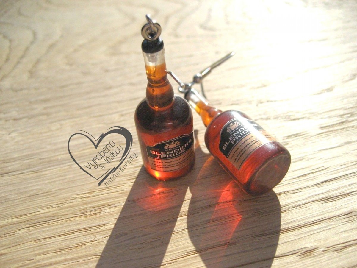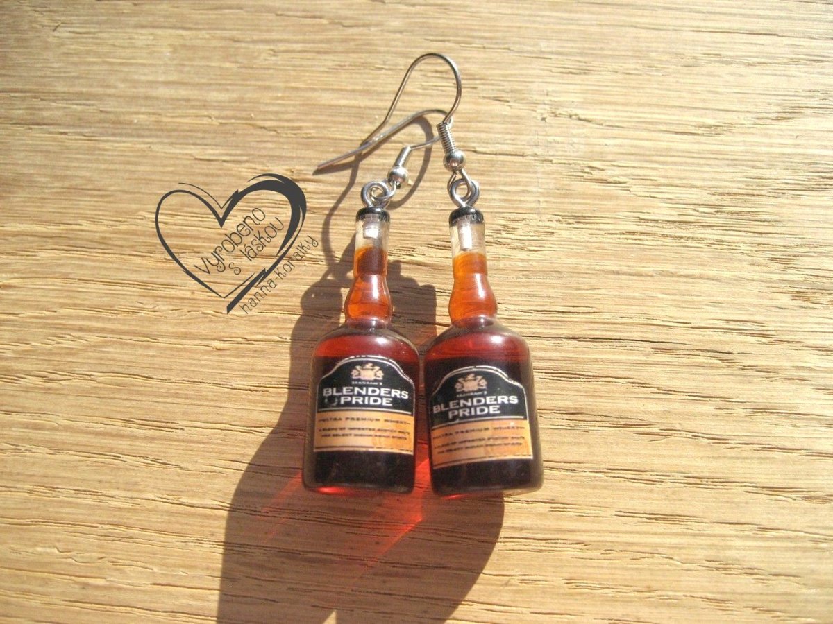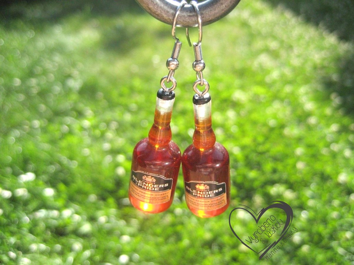 Vtipné náušnice z pryskyřice - mini láhev whisky - výška motivu 3,5 cm + naušnicový háček z nerez oceli, uvedená cena za 1 pár náušnic