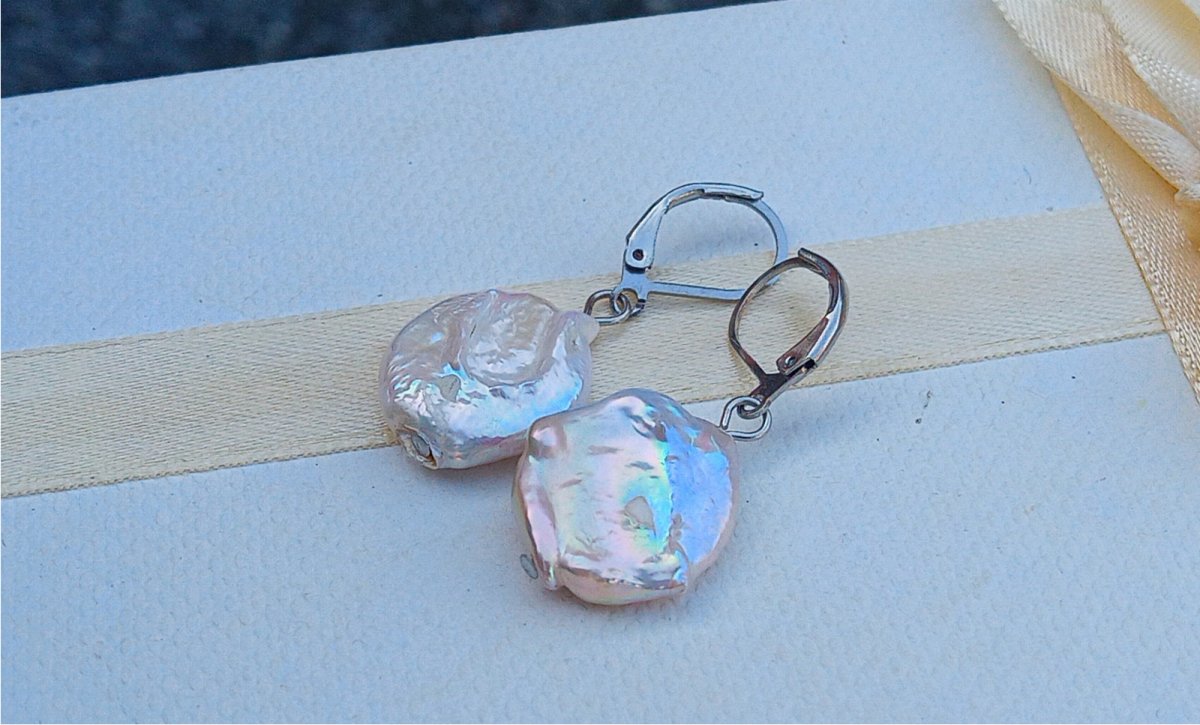 Tyto elegantní visací náušnice se vyznačují výraznými, nepravidelně tvarovanými jihomořskými perlami, které mají rozměry přibližně 15 mm v průměru. Perly vynikají vysokým perleťovým leskem s nádhernými duhovými odlesky na povrchu.