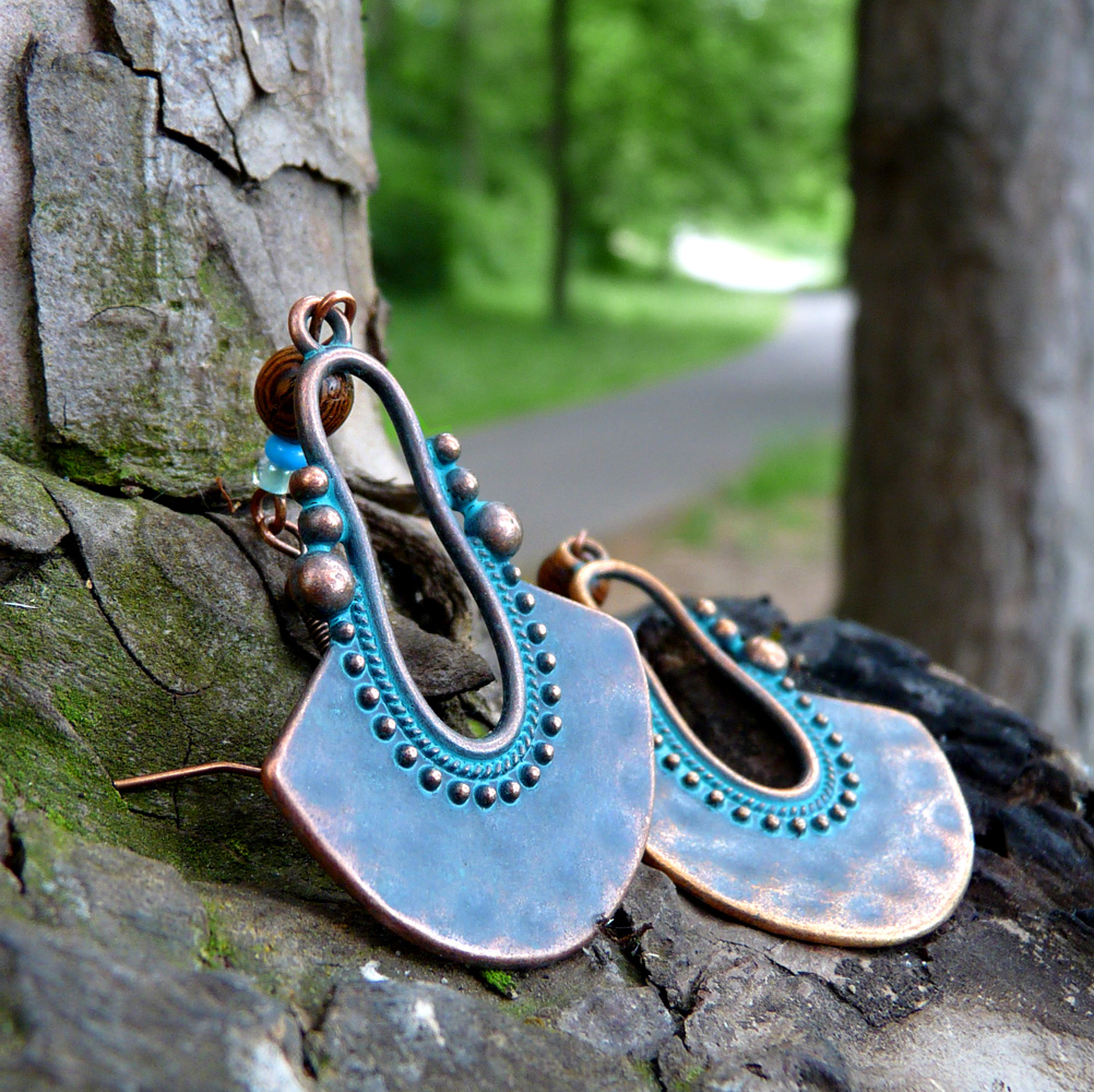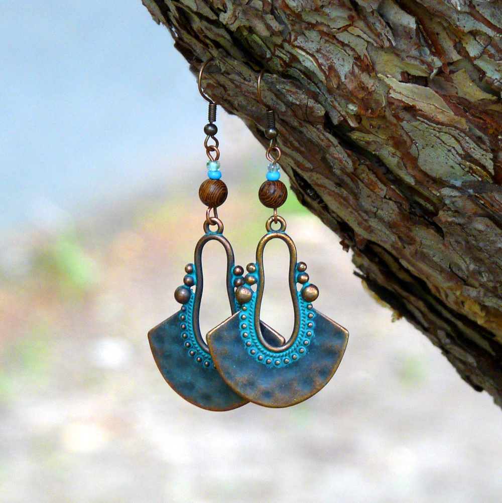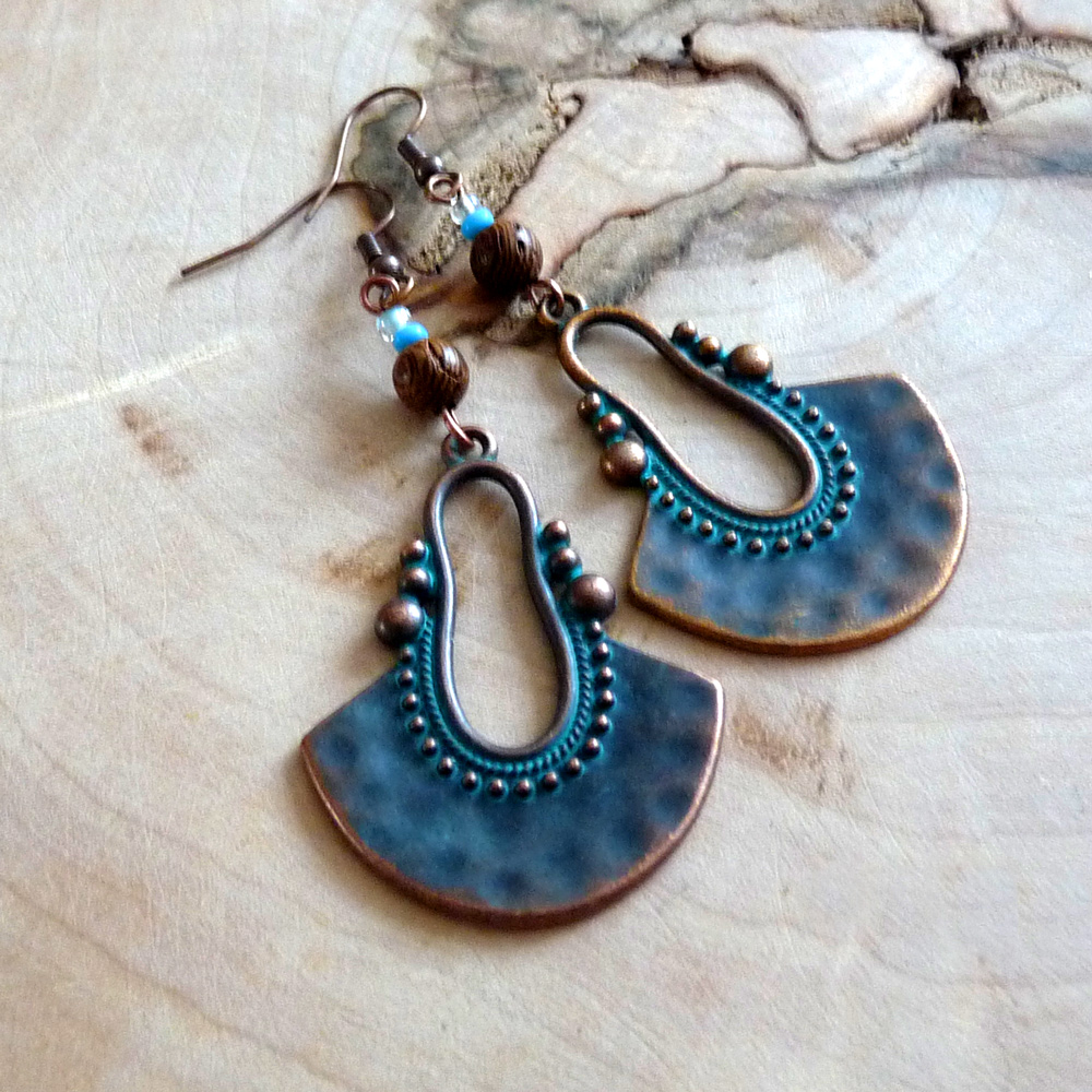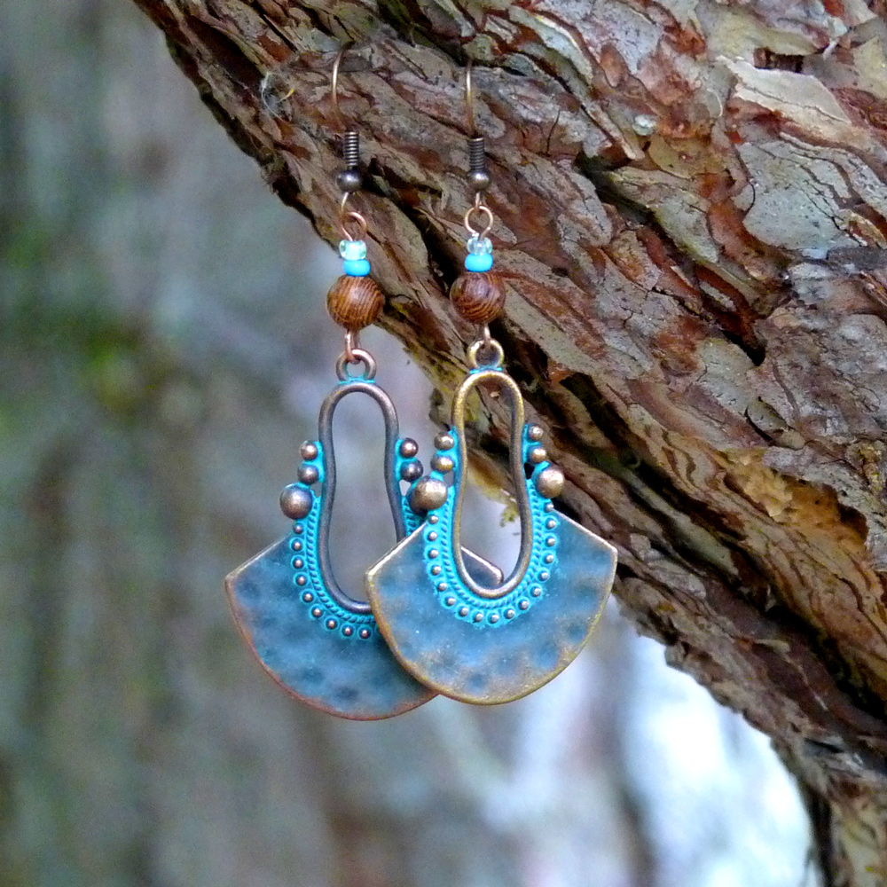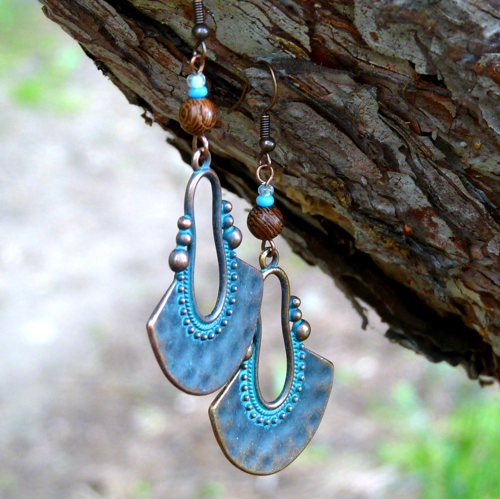 Náušnice s atraktivním přívěskem ve tvaru vějíře s modrou patinou