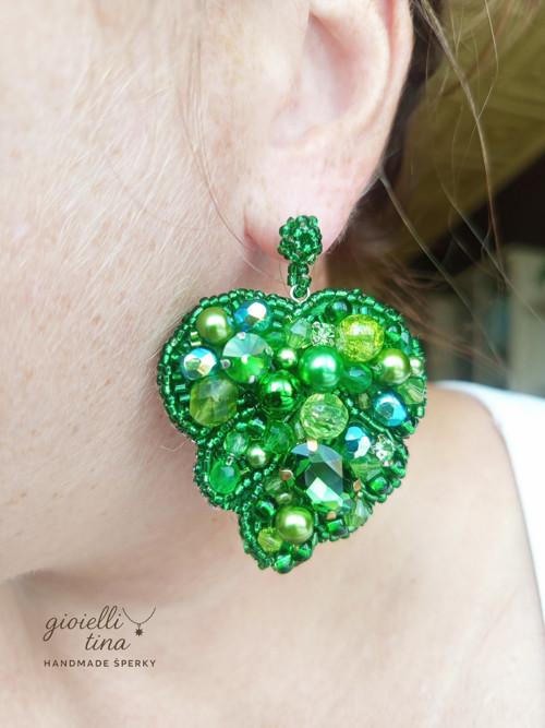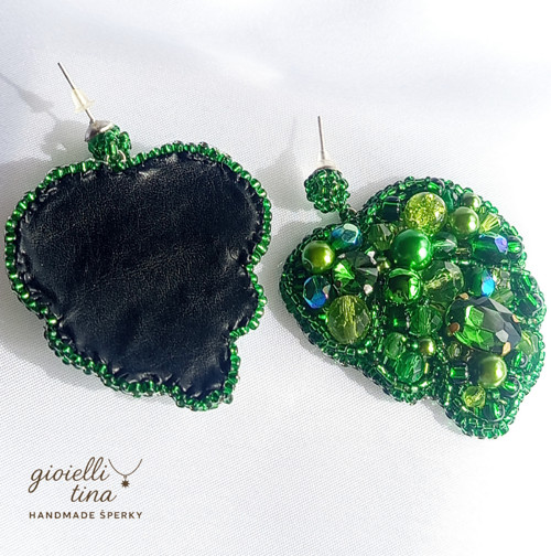 Tyto ručně šité náušnice ve tvaru lístku jsou bohatě zdobené korálky v různých odstínech zelené barvy. Kombinují se zde lesklé perličky, fasetované korálky i drobné rokajlové korálky, které spolu vytvářejí krásnou texturu a odlesky. Zářivě zelená barva symbolizuje přírodu, růst a harmonii. Náušnice se zapínají na puzetu a jsou ideální pro ty, kteří hledají výrazný a originální šperk, který přitáhne pozornost.