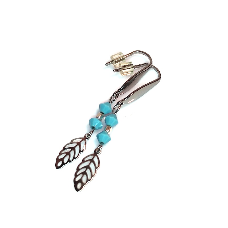 Náušnice jako blankytné nebe, modré korálky Swarovski v broušeném tvaru připomínají malé nebeské diamanty. Každý při pohybu zachytává světlo a mění se jako hladina kouzelného jezera. Pod nimi se houpají kovové lístky z nerezové oceli, tenké a pevné jako samotná lesní magie. Nerezová ocel je věčná – nevadí jí čas ani příběhy, které si odneseš na svých cestách.
