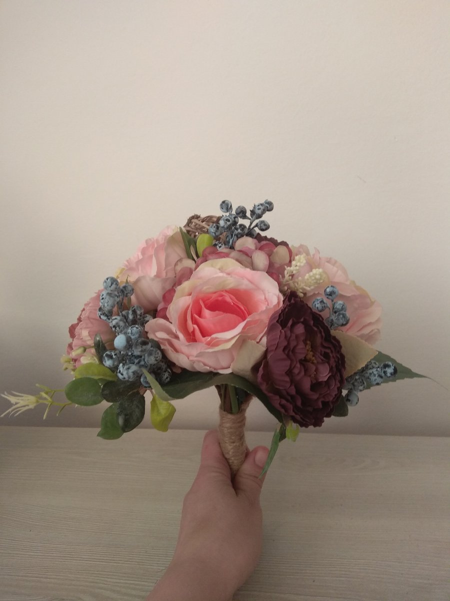 Kytice z umělých květin v jemných odstínech růžové. Průměr kytice je přibližně 22 cm.