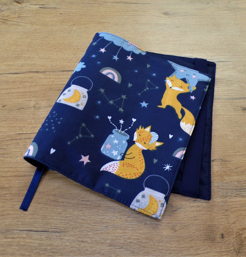 Obal na knihu ušitý z bavlněných látek, na vrchní straně tmavě modrá látka s liškami, spodní strana je z tmavě modré jednobarevné bavlny. Obal je vyztužený a po okraji prošitý pro zpevnění a dobře drží tvar, všitá záložka.