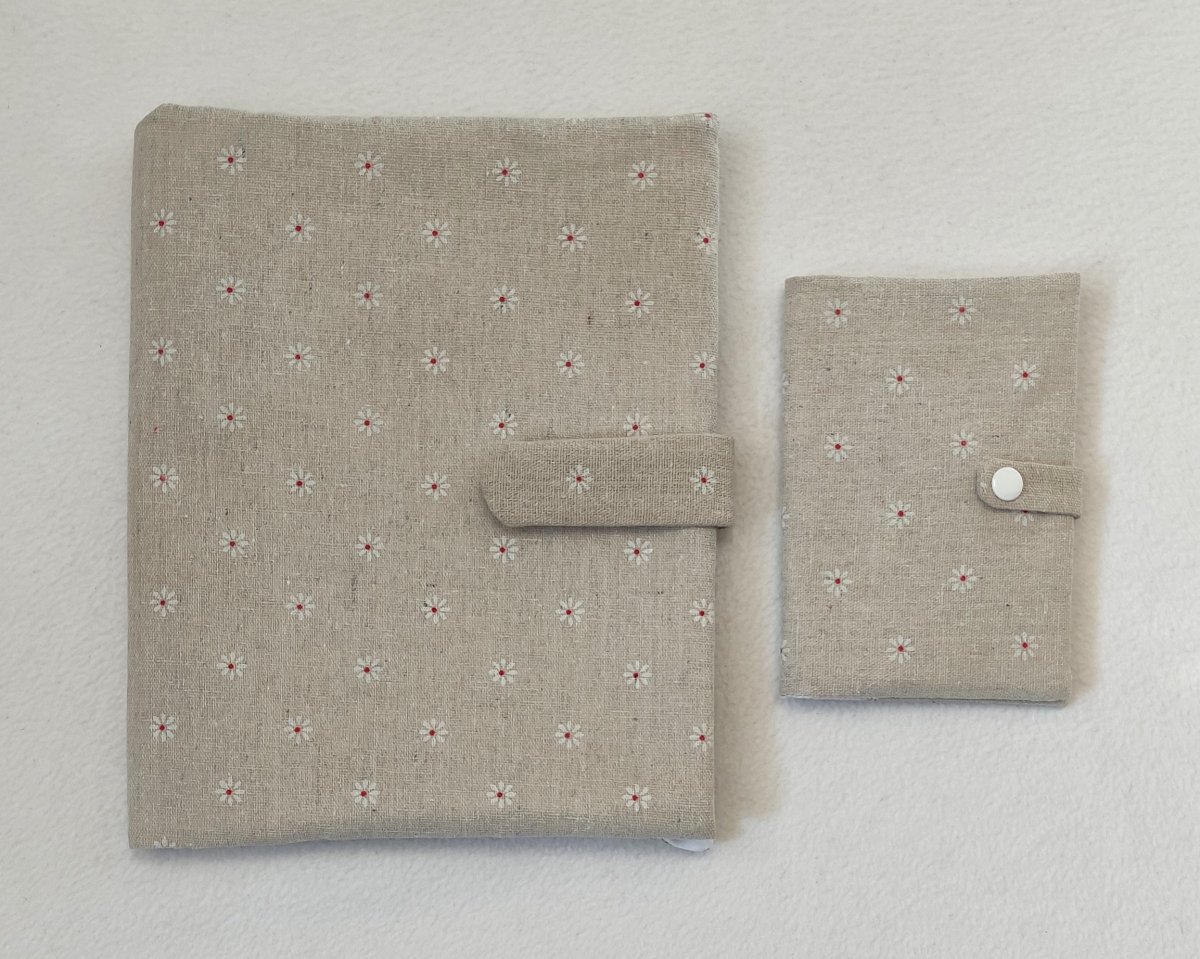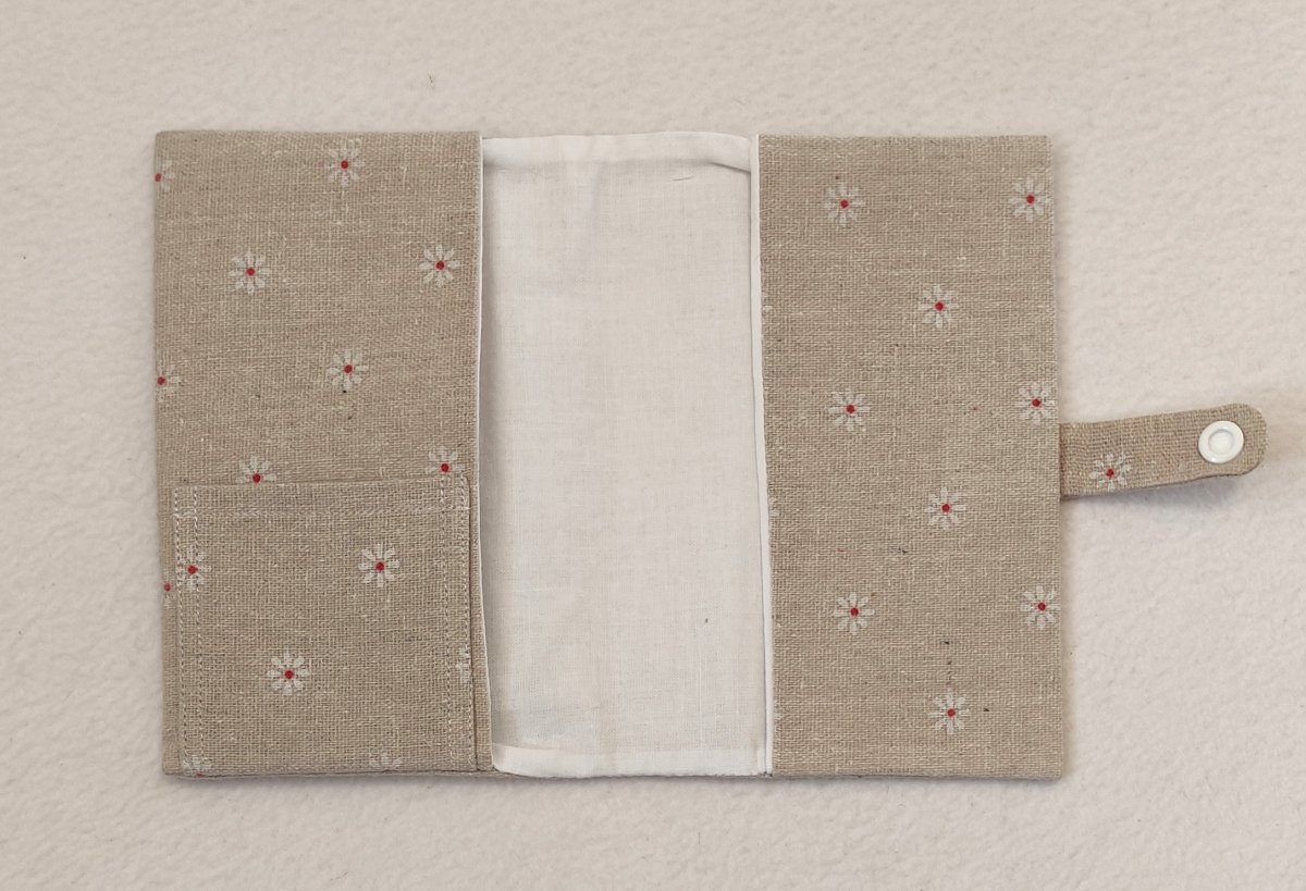 Obal o velikosti A6 je ušitý z bavlněných látek. Vnější strana je vyztužena vliselinem.