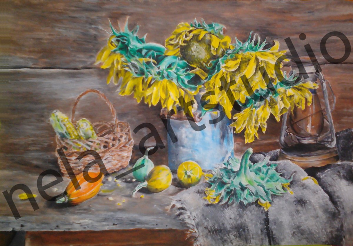 Malba štětcem akrylovými barvami na papíře. Součástí je černý rám. Rozměr formát A3.