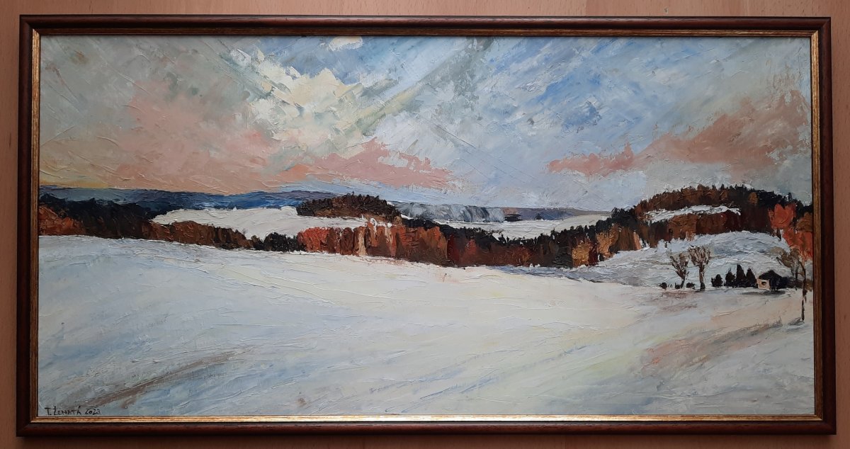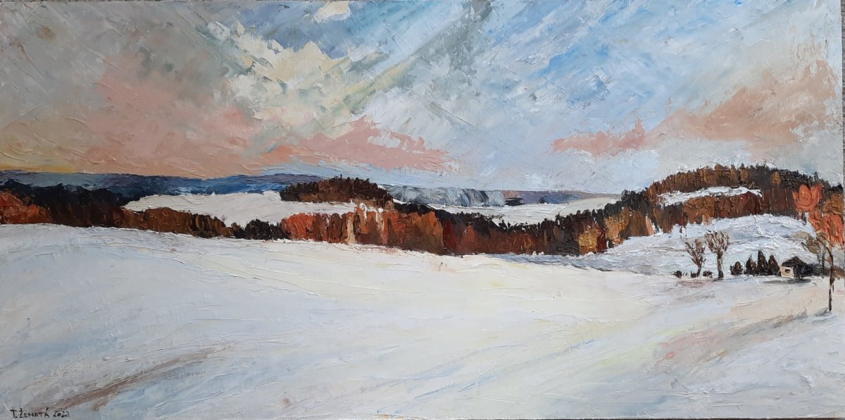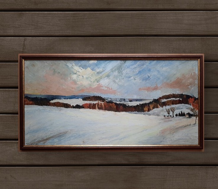 scéna zasněžené krajiny. Celý obraz je zalit mekkým zimním světlem a modravými odstíny. Malba evokuje klid a ticho zimního období a přináší pocit odpočinku a nostalgie.