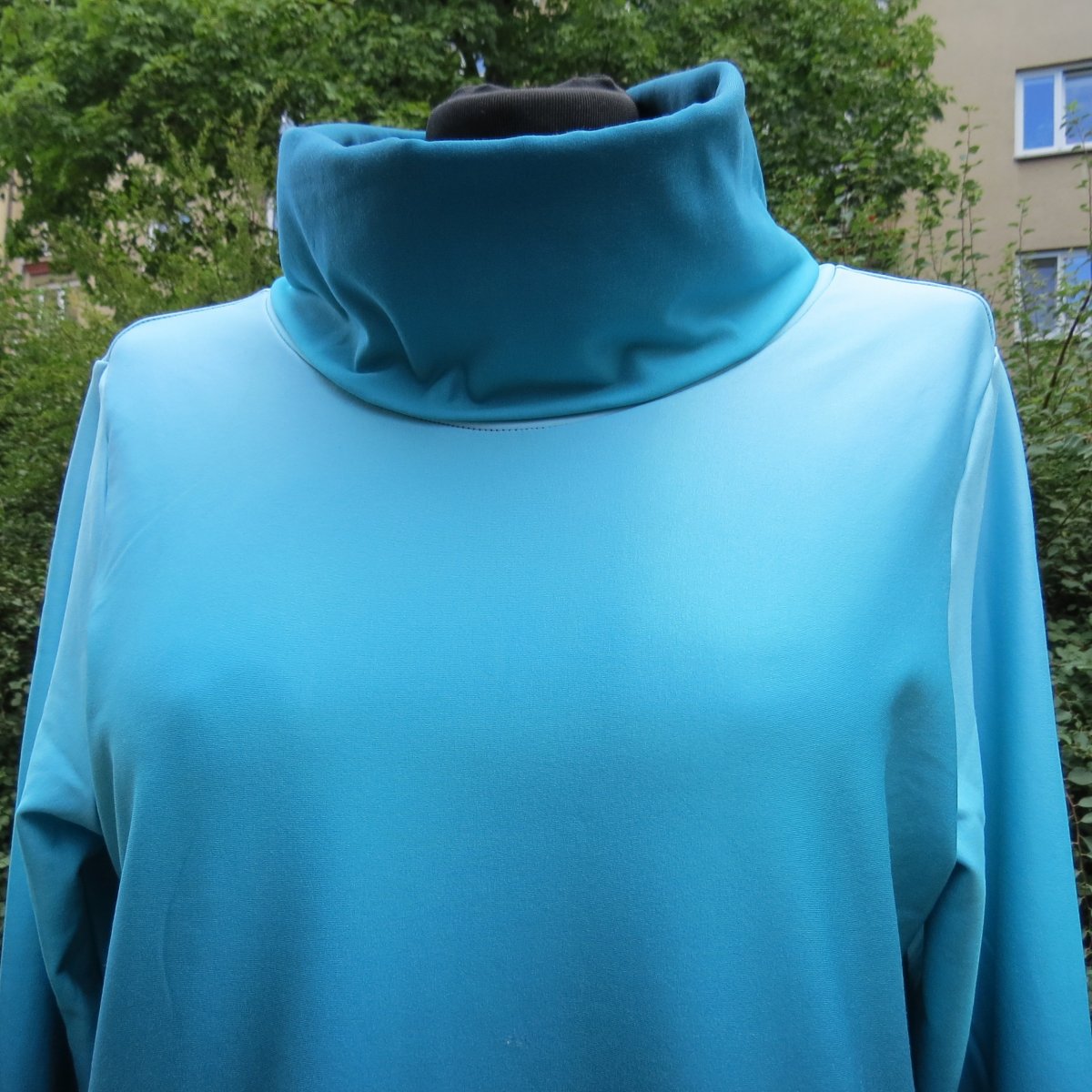 Mikinošaty z ombré úpletu. Vzor přechází od antracitové barvy dole přes zelenou až do modrozelené. Materiál je počesaný funkční úplet s nanočásticemi stříbra, který saje pot a brání zápachu. Z vnitřní strany je počesaný - má jemný chloupek - a je velmi příjemný na těle a hřejivý. U krku mají vysoký rolák, spodní okraj je stažený do manžety..