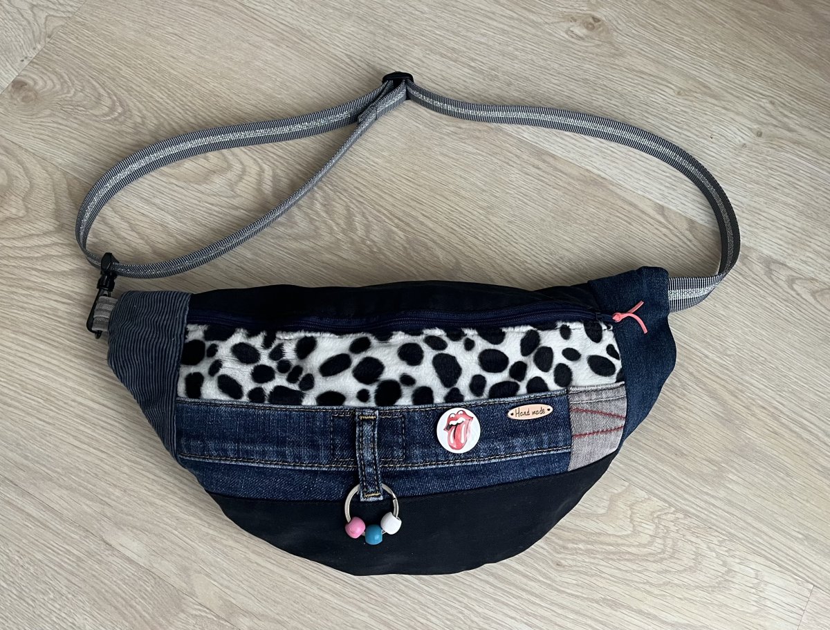 Velmi originální ledvinka ušitá z různých druhů jeansovin a pevných látekExistuje jediný kusZapínání na zipNastavitelný popruhPodšitá bavlněnou látkouDrobné dekorace (odnímatelné) na přední straně