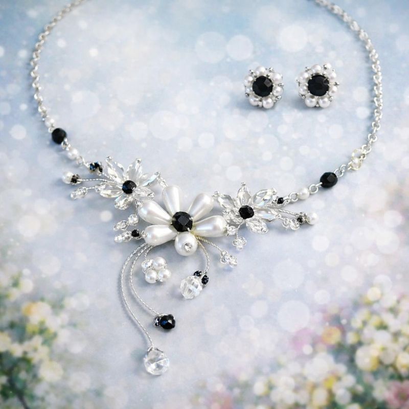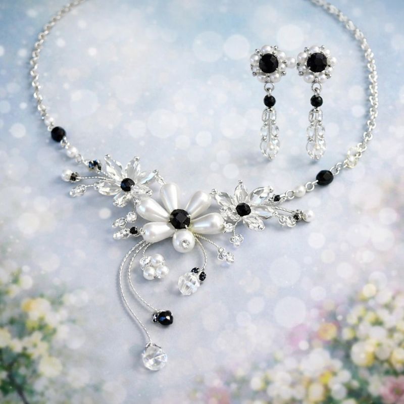 Ručně vyráběný šperkový set, který v sobě spojuje nadčasovou eleganci perel s výrazem černých krystalů. Dominantní květinový náhrdelník je doplněn jemnými peckovými náušnicemi do ucha, díky nimž set působí harmonicky a velmi vkusně. Ideální volba k černým šatům, slavnostním příležitostem i jako výrazný doplněk pro večerní eleganci.