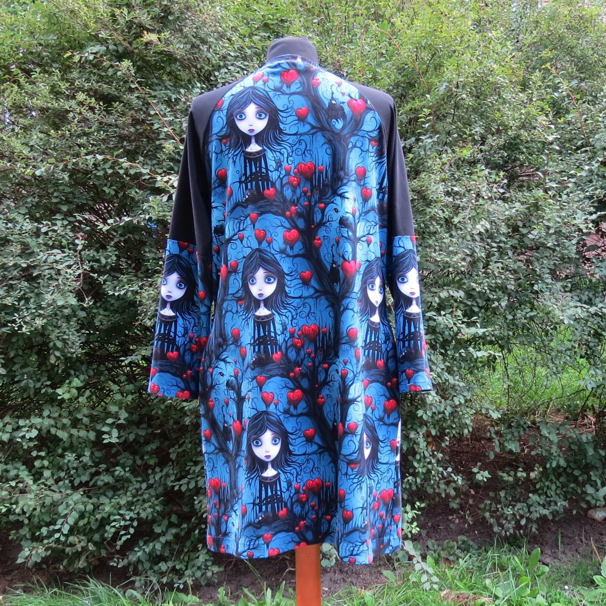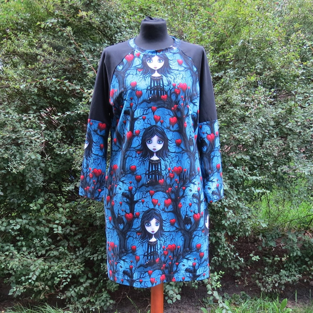 Rozměry: horní obvod = 102 cm, boky = 108 cm, délka rukávu od krku 65 cm, délka šatů 90 cm. Protože jde o úplet, povolí a přizpůsobí se i postavě s o trochu většími rozměry. Dobře padnou ženám, které nosí konfekční velikost 44.