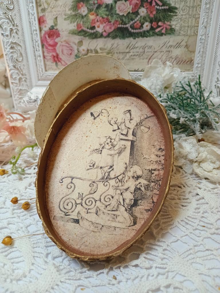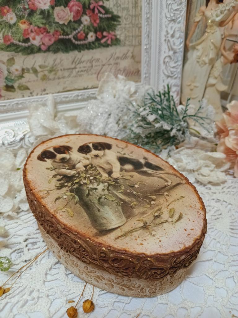 Dřevěná krabička s motivem pejsků a květináčem se jmelím ve vánočním nádechu. Víko krabičky je zevnitř dekorované motivem andílka zvonícího u dveří. Okolo víka a spodního dílu, je reliéfní bordura, lehce přepatinovaná hnědou barvou a zlatavým voskem.