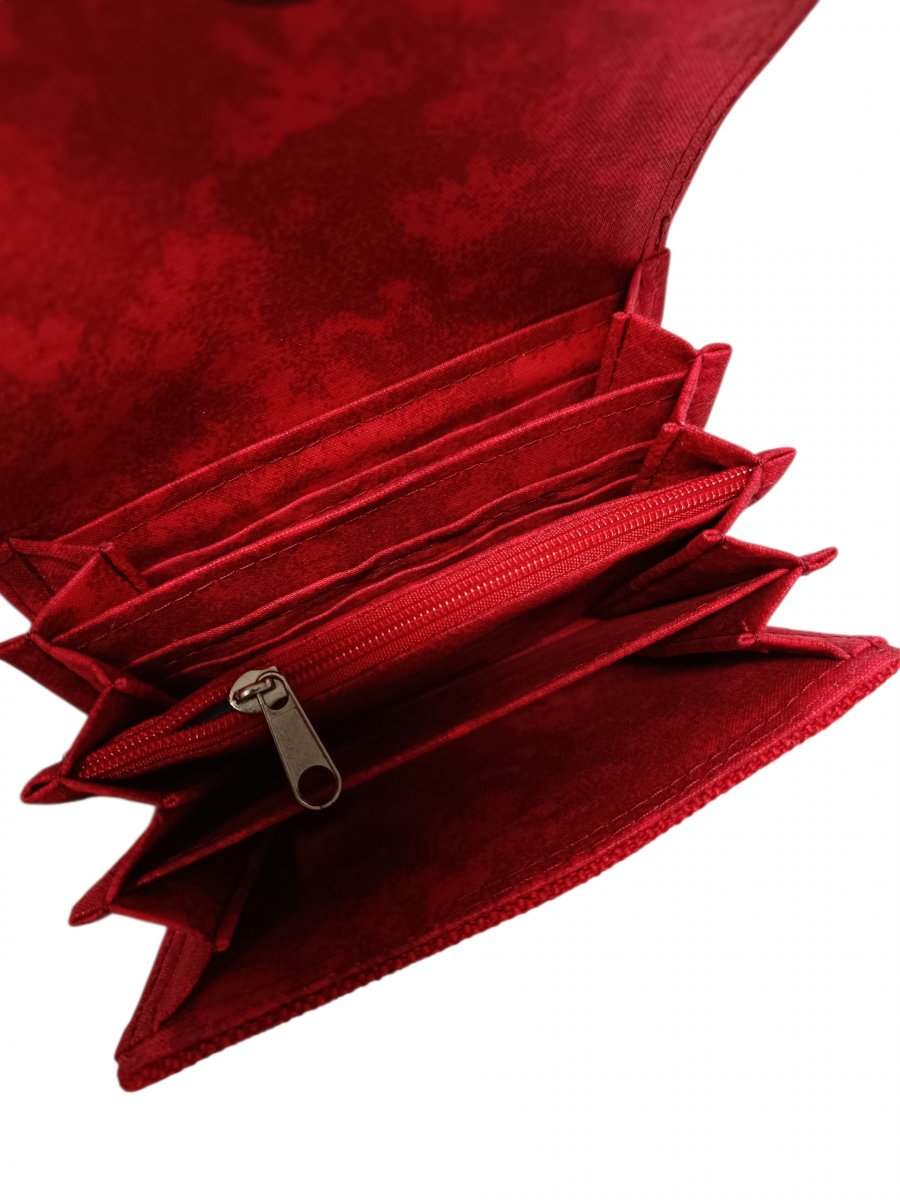 Peněženka, která vznikla z kombinace potahové látky a bavlny, je vyztužená, takže si dlouho udrží svůj tvar i pěkný vzhled.