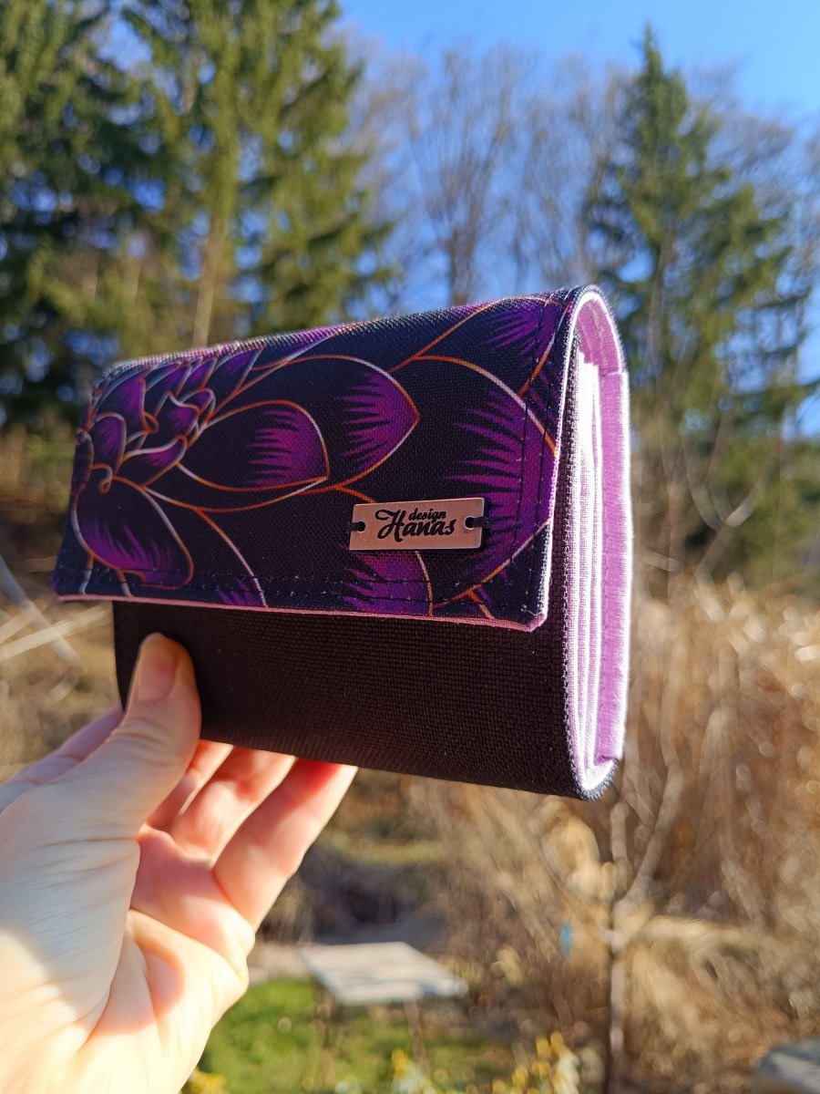Peněženka, která vznikla z kombinace potahové látky a kočárkoviny, je vyztužená, takže si dlouho udrží svůj tvar i pěkný vzhled.
