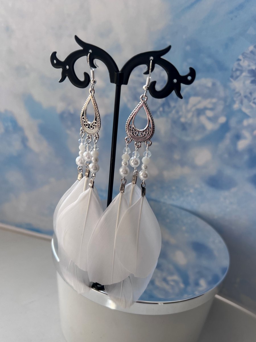 Nepřehlédnutelné "boho" náušnice s bílými peříčky, perlovými korálkami a kovovými komponenty v barvě stříbra. Délka od háčku 12 cm. Háček, ramínko a komponenty v barvě stříbra - běžný kov, gumové zarážky.