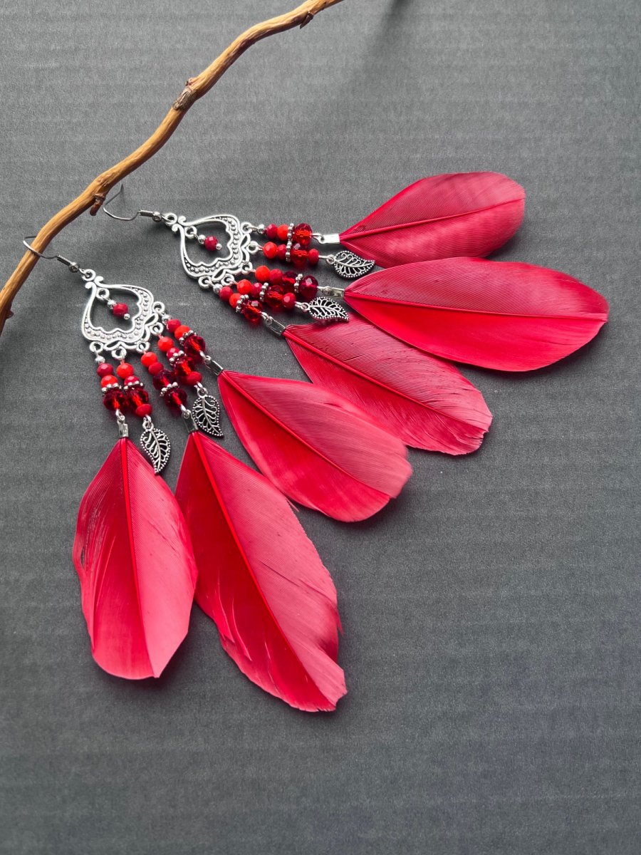 Nepřehlédnutelné "boho" náušnice s červenými peříčky, skleněnými broušenými korálkami a kovovými komponenty v barvě stříbra. Délka od háčku 13 cm. Háček z nerez oceli, ramínko a komponenty v barvě stříbra - běžný kov, gumové zarážky.
