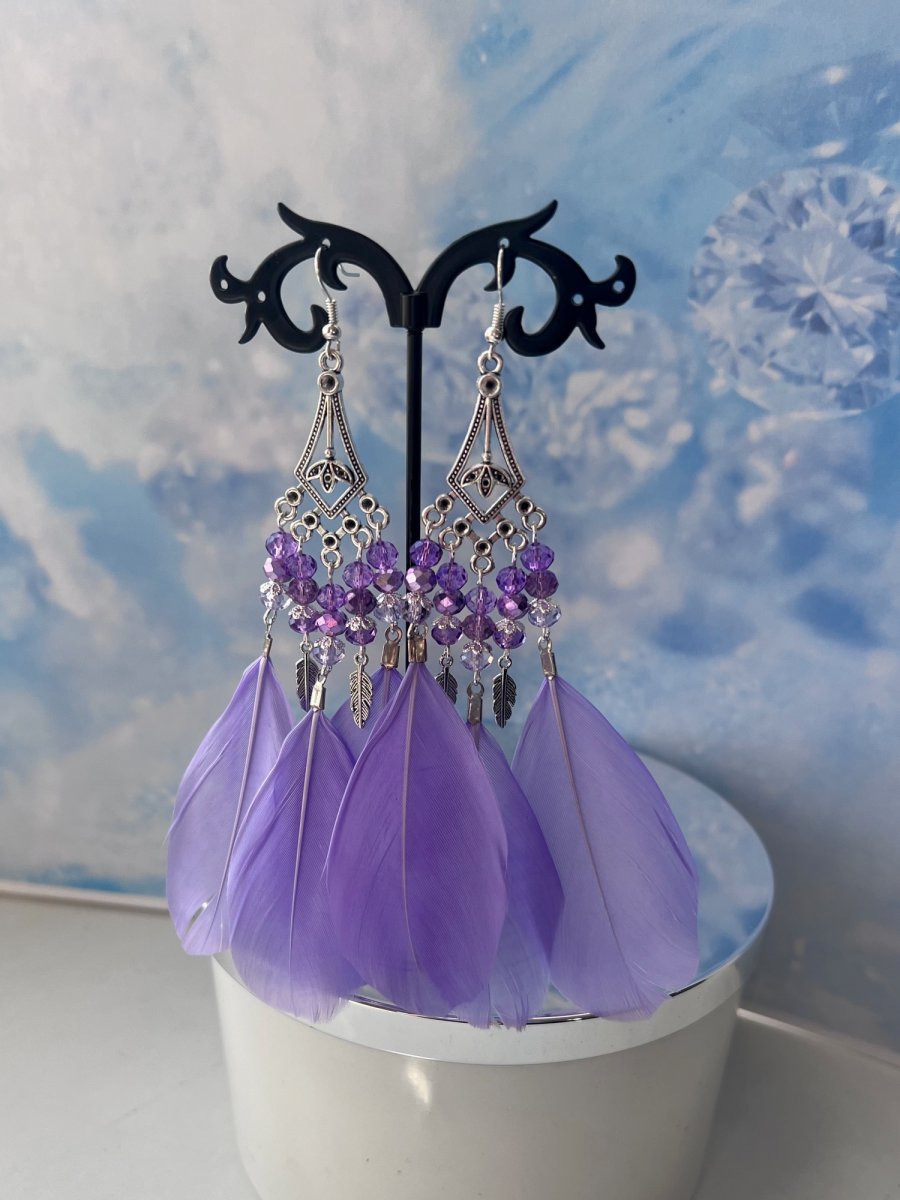 Nepřehlédnutelné "boho" náušnice s fialovými peříčky, skleněnými korálkami a kovovými komponenty v barvě stříbra. Délka od háčku 12 cm. Háček, ramínko a komponenty v barvě stříbra - běžný kov, gumové zarážky.