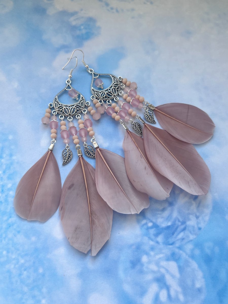 Nepřehlédnutelné "boho" náušnice se pudrovými peříčky, korálkami a kovovými komponenty v barvě stříbra. Délka od háčku 12 cm. Háček, ramínko a komponenty v barvě stříbra - běžný kov, gumové zarážky.
