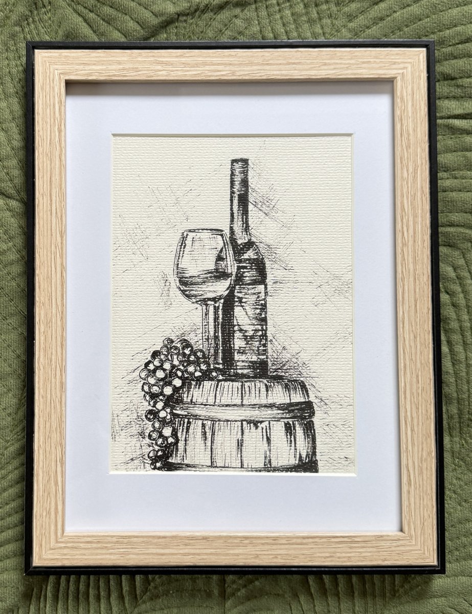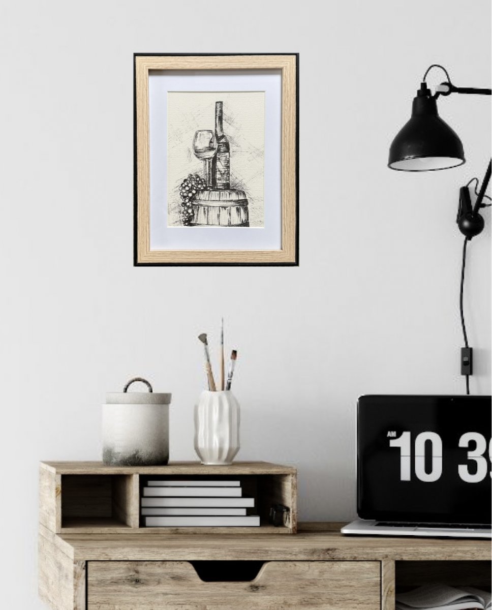 Perokresba na papíře, vykresluje elegantní kompozici láhve vína, sklenice a ovoce. Skvěle zapadne do interiérů s vinárenskou nebo klasickou estetikou.