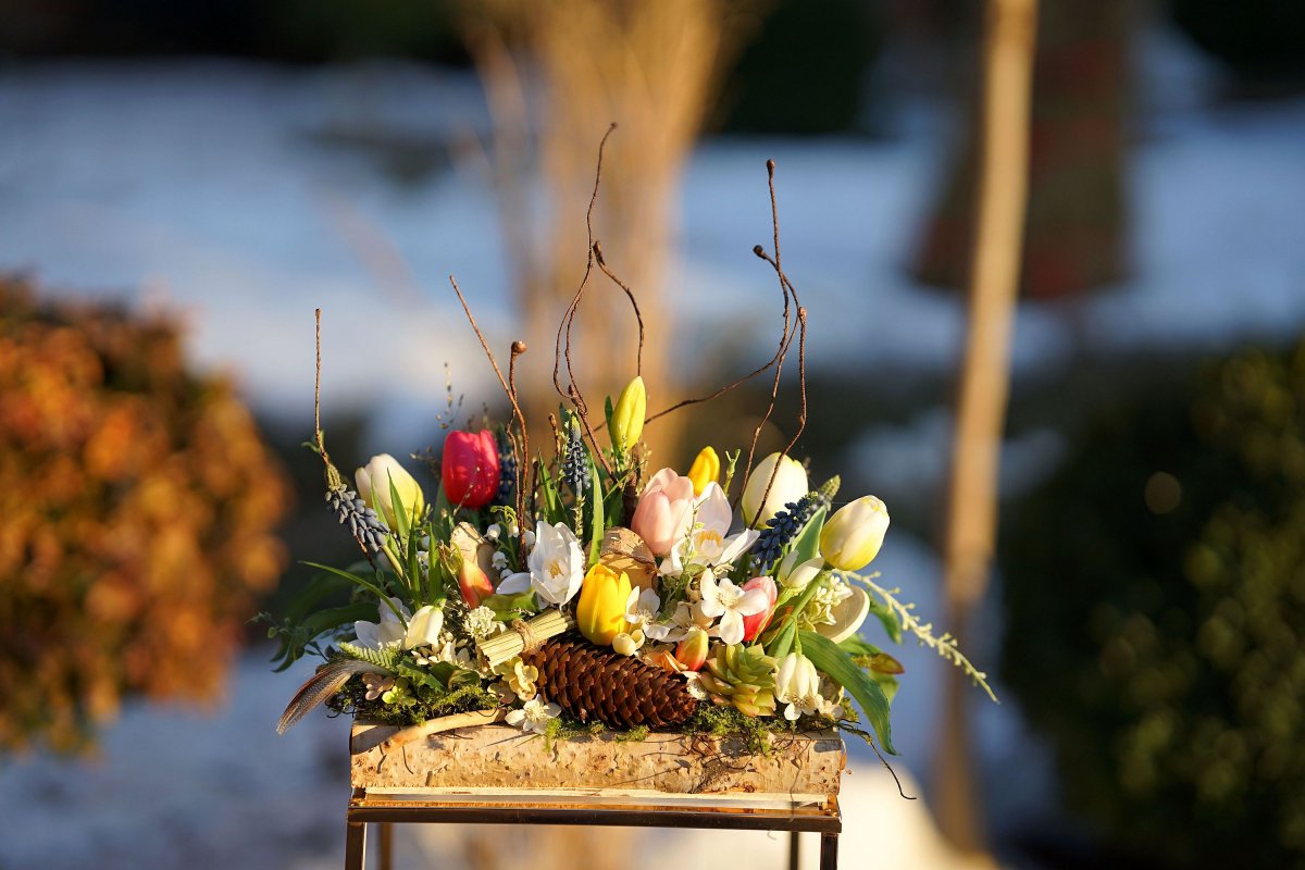 Nízký březový truhlíček a v něm spousta jarních kytiček v kvalitním realistickém zpracování. Květiny jsou převážně latexové a působí živým dojmem, mech je umělý, přírodnini pravé. Dekorace vydrží dlouhé roky. Rozměr 33x16x35 (po špičky větviček)