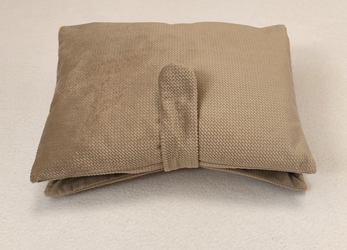 Plenkovník je ušitý z Velvet sametu barvy capuccino (100% polyester), který v sobě skrývá eleganci, luxus, funkčnost a zároveň neodolatelnou měkkost. Podšívka je ze 100% bavlny. Plenkovník je vyztužen vliselinem, takže hezky drží tvar. Zapínání je na magnetický patent s možností zapnutí na dvě polohy.