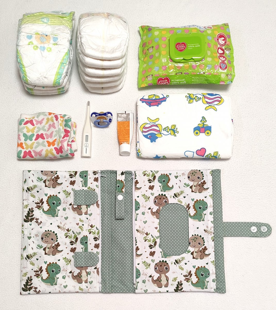 Do tohoto plenkovníku 6 v 1 uložíte 4 ks papírových plen o velikosti 4+ a 4 látkové pleny (nebo místo látkových plen zde uložíte 6 ks nejmenších papírových plen), vlhčené ubrousky, přebalovací podložku, body triko a případně tubu s krémem a teploměr.