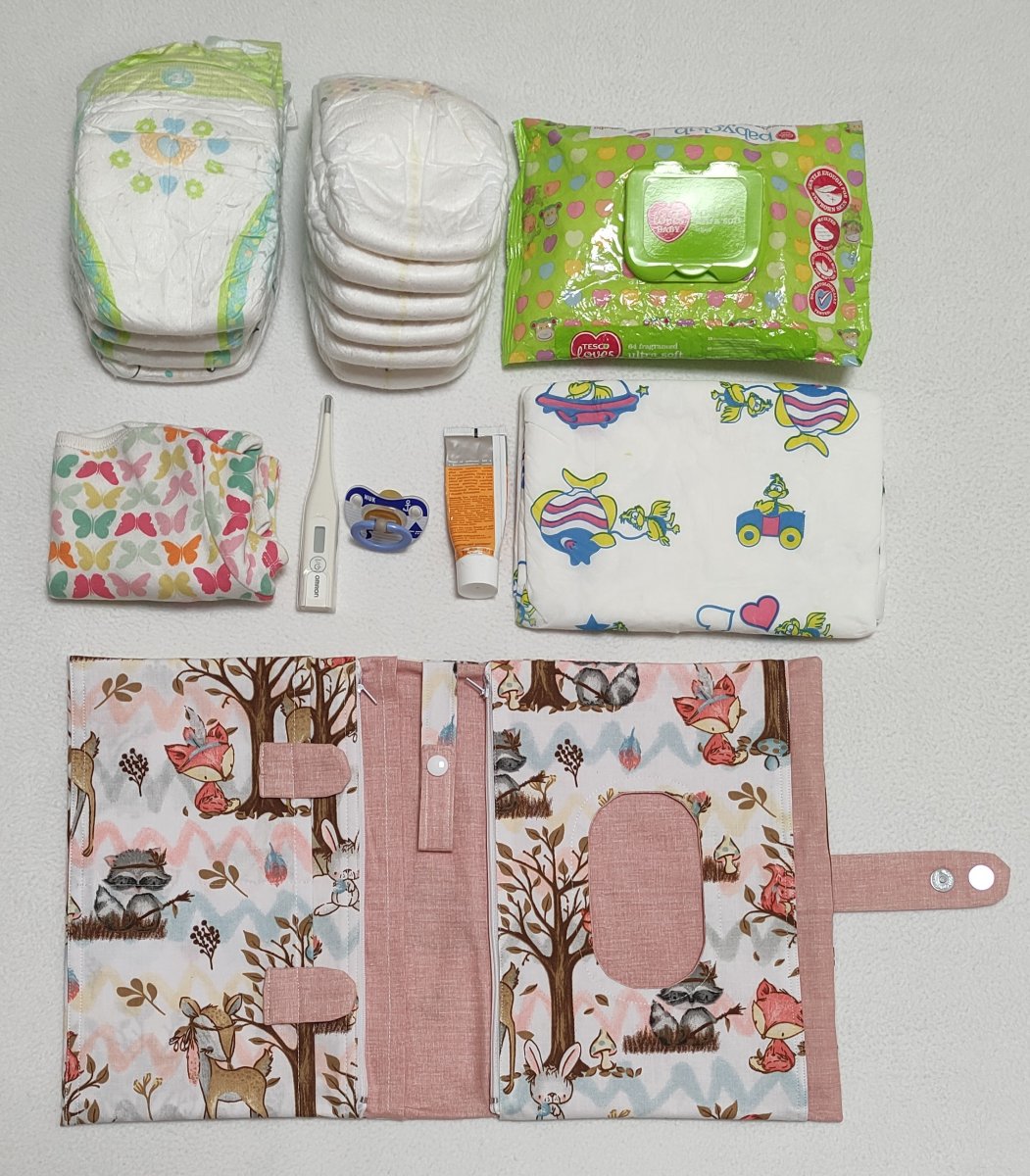 Do tohoto plenkovníku 6 v 1 uložíte 4 ks papírových plen o velikosti 4+ a 4 látkové pleny (nebo místo látkových plen zde uložíte 6 ks nejmenších papírových plen), vlhčené ubrousky, přebalovací podložku, body triko a případně tubu s krémem a teploměr.
