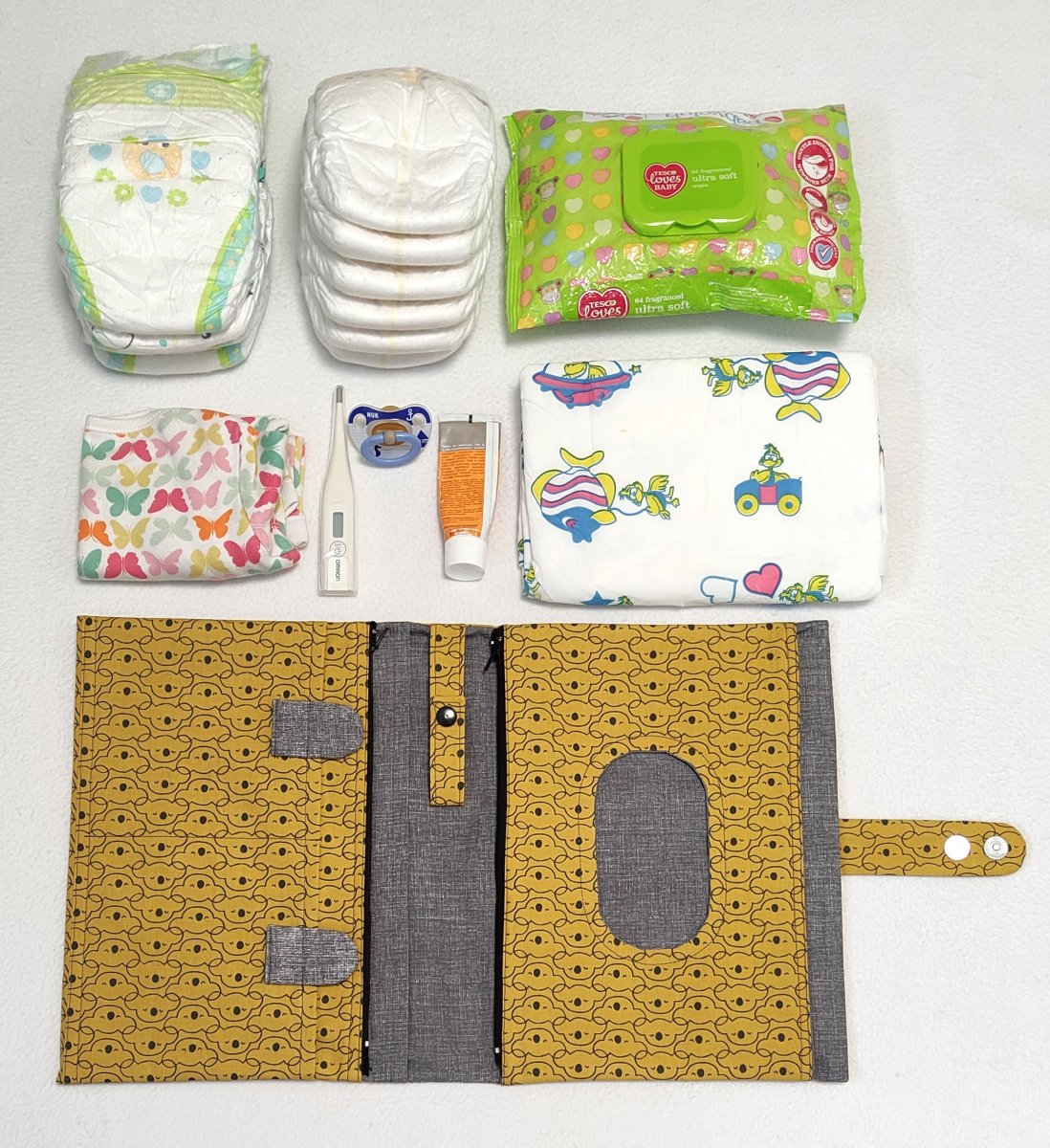 Do tohoto plenkovníku 6 v 1 uložíte 4 ks papírových plen o velikosti 4+ a 4 látkové pleny (nebo místo látkových plen zde uložíte 6 ks nejmenších papírových plen), vlhčené ubrousky, přebalovací podložku, body triko a případně tubu s krémem a teploměr.