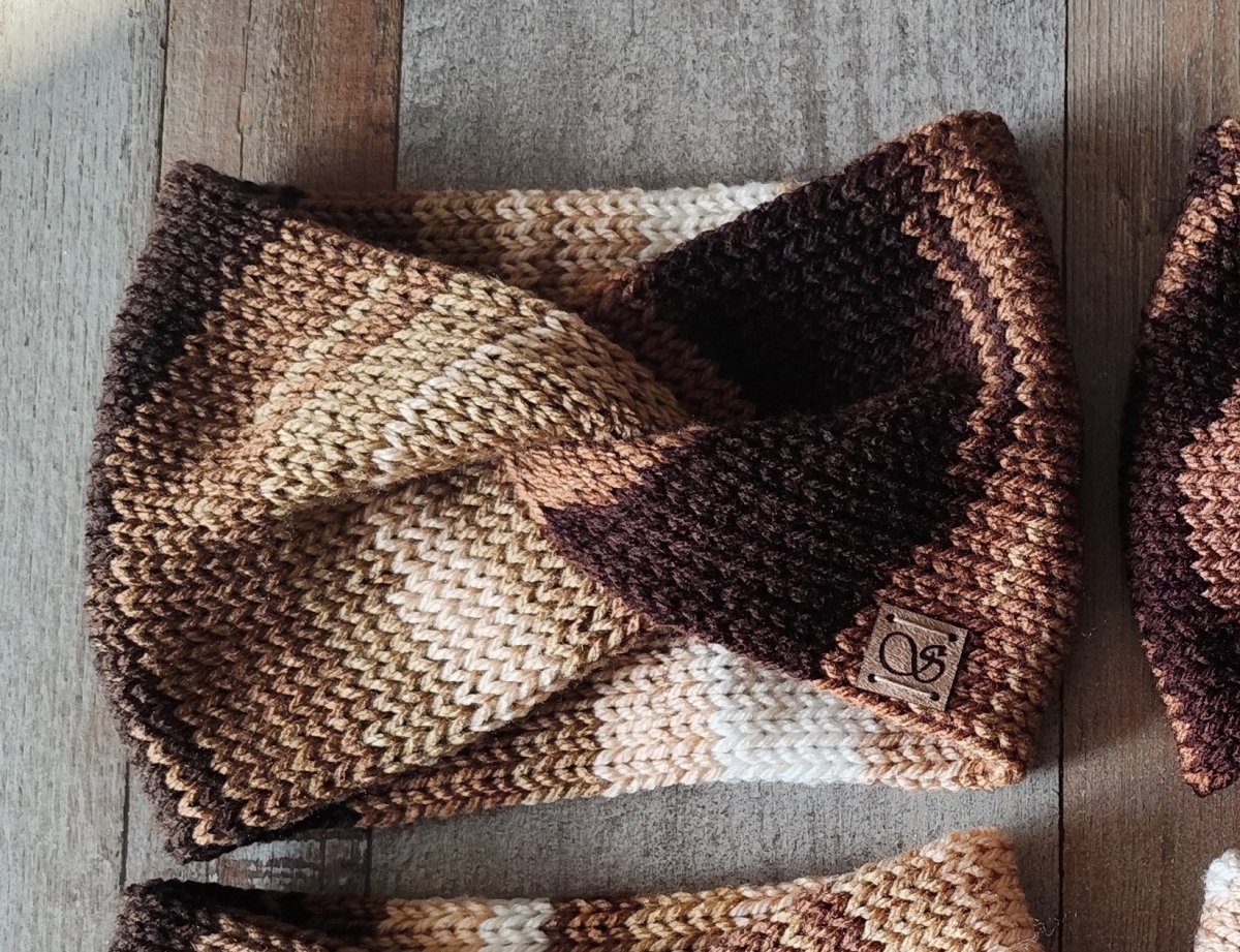 Díky batikované přízi je každá čelenka trošičku jiná. Každá je dozdobena semišovým štítkem s naším logem, které lze snadno odstřihnout.