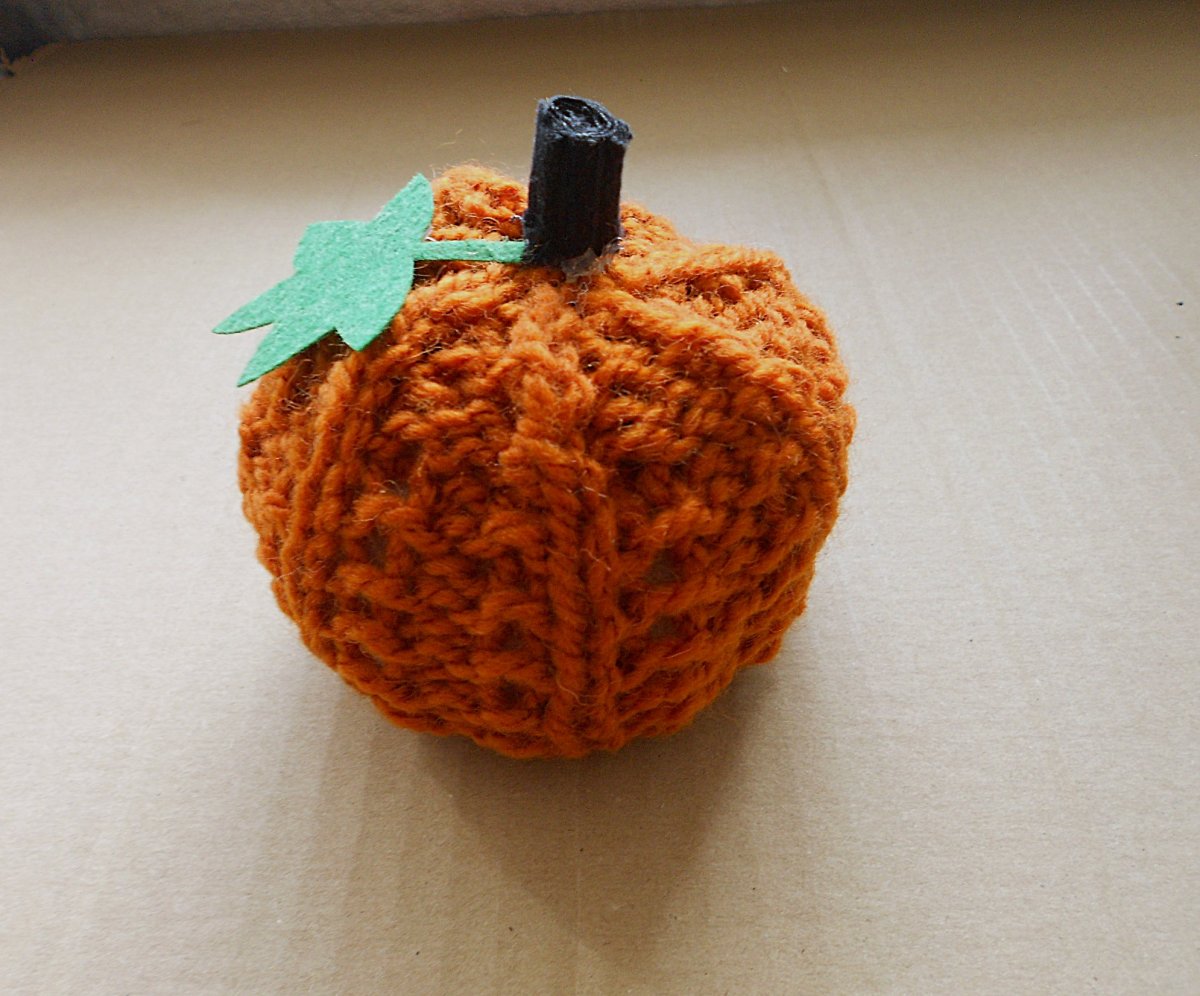 Ručně pletená dýně průměr 26 cm, výška bez stopky 7 cm, plněná vatelínem, barva rezavá.