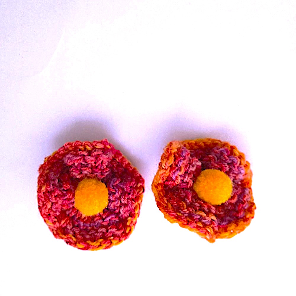 Růžovo-oranžová pletená gumička do vlasů. Pletená kytička, i gumička jsou přilepené na riflovině pro větší pevnost. Průměr kytičky je 6cm, průměr gumičky 2,5 cm, gumička je jemná, na dvojí otočení, viz. 2. fografie.