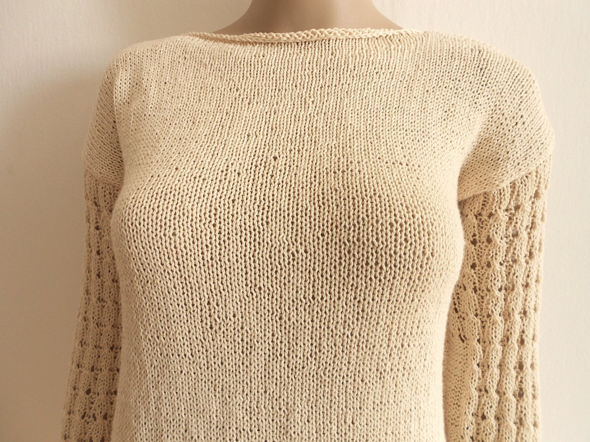 Dámská, ručně pletená halenka, 100% bavlna. Lodičkový výstřih, který umožňuje různé způsoby nošení. Velikost S,M,: délka 60 cm, šířka 47cm, vnitřní délka rukávu 48 cm. Doporučuji jemné praní a sušit volně položené.