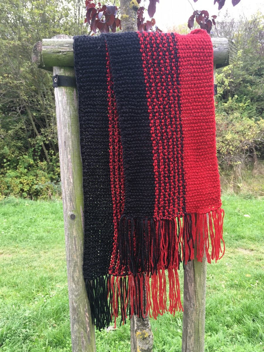 Ve dvou výraznývch barvách, černé a sytě červené je upletená šála, kterou na podzim a v zimě užijí dámy, možná i odvážnější pánové.