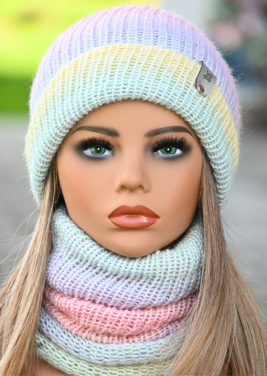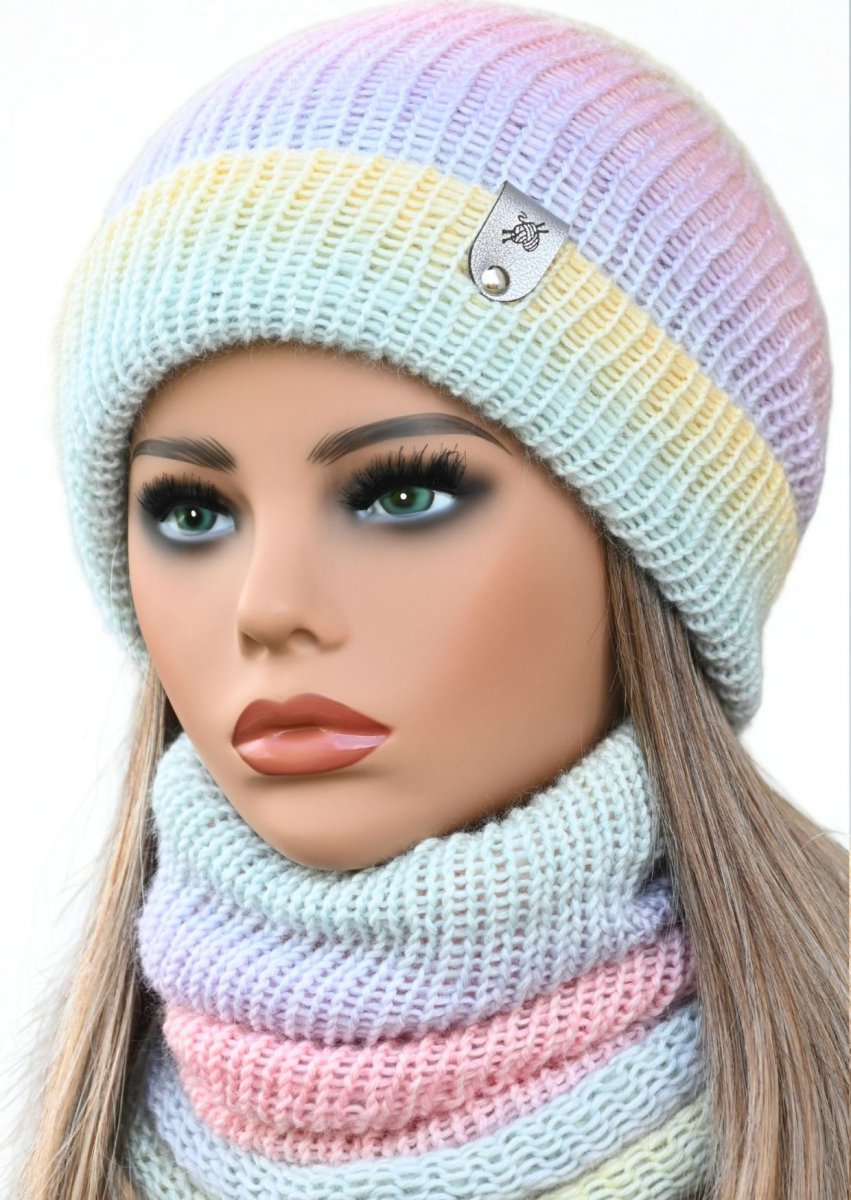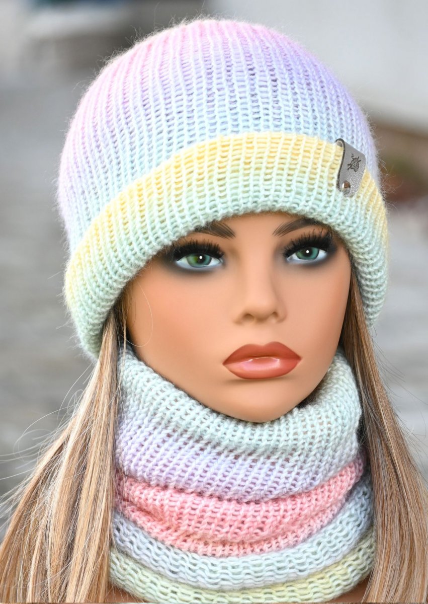 Pletená čepice s nákrčníkem – hřejivý set pro zimní dny v nádherných duhových barvách s jemnými přechody barev