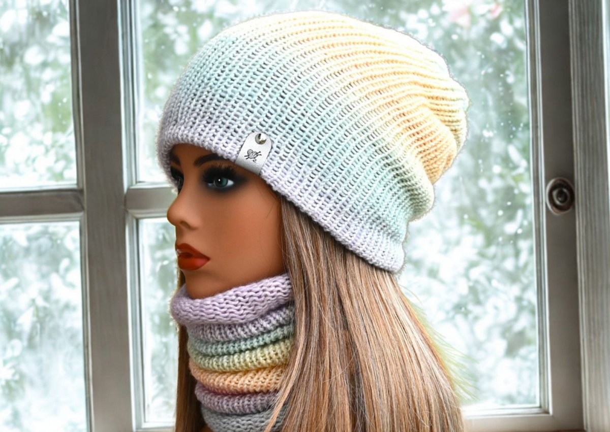 Pletená čepice s nákrčníkem – hřejivý set pro zimní dny v nádherných duhových barvách s jemnými přechody barev