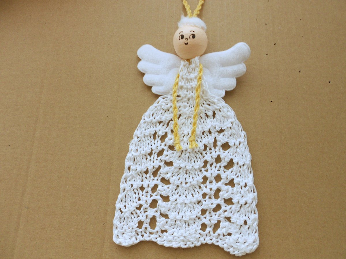 Ručně pletený andělíček, podle vlastního návrhu. Velikost: výška bez šňůrky na zavěšení 20 cm, šířka 11 cm, mírně naškrobený, ale drží tvar i bez škrobení.