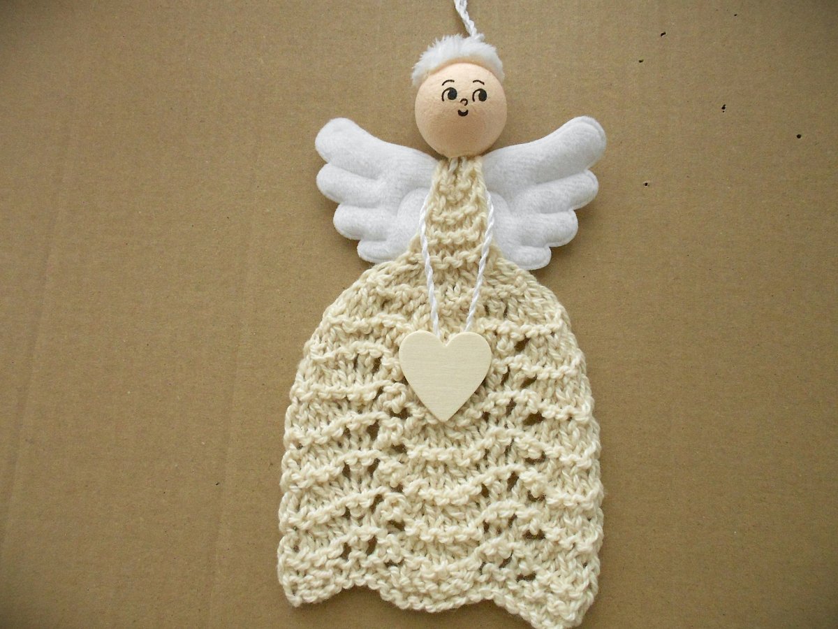 Ručně pletený andělíček s dřeveným srdíčkem, podle vlastního návrhu. Velikost: výška bez šňůrky na zavěšení 18 cm, šířka 11 cm, mírně naškrobený, ale drží tvar i bez škrobení.