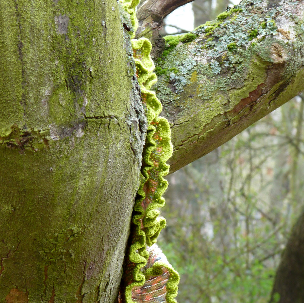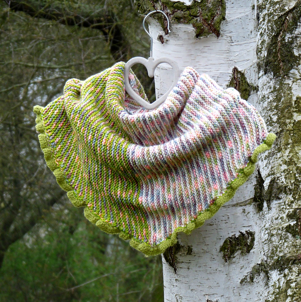 Šátek je obháčkovaný zelenou přízí, která tvoří zvlněný okraj