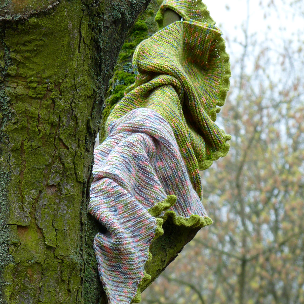 Šátek je pletený vroubkovaným vzorem z výrazných tenkých přízí, pečlivě seskládaný tak, aby vzniklo jedinečné barevné ladění.