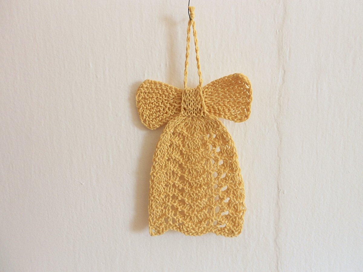 Ručně pletený zvoneček k zavěšení, podle vlastního návrhu. Velikost: výška bez šňůrky na zavěšení 17 cm, šířka 12 cm, mírně naškrobený, ale drží tvar i bez škrobení.