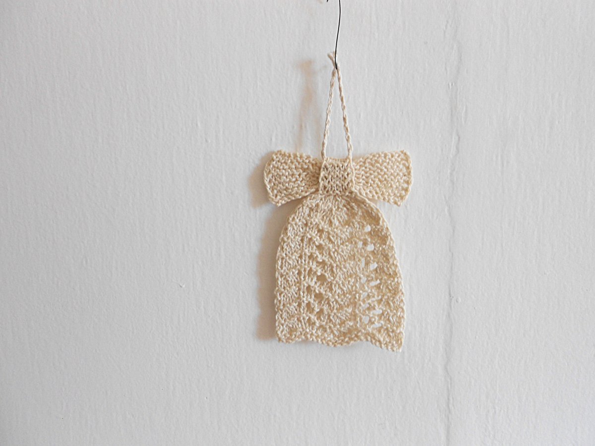 Ručně pletený zvoneček k zavěšení, podle vlastního návrhu. Velikost: výška bez šňůrky na zavěšení 15 cm, šířka 13 cm, mírně naškrobený, ale drží tvar i bez škrobení.